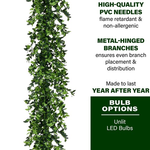 - Festive 9-ft. Boxwood garland designed for indoor or covered outdoor use