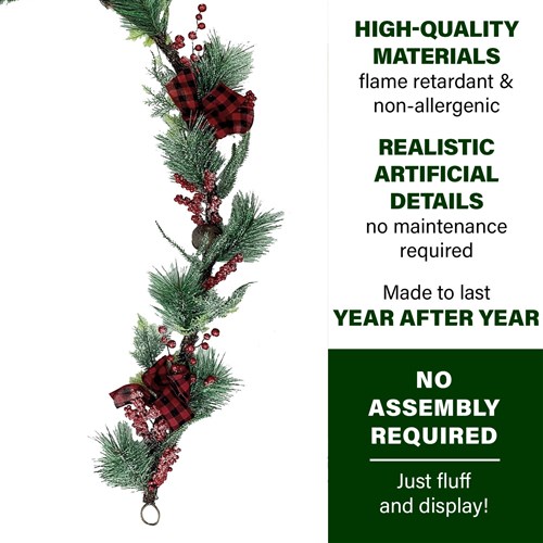- Handcrafted grapevine garland trimmed with frosted pine, red berries, buffalo plaid bows, and rustic sleigh bells