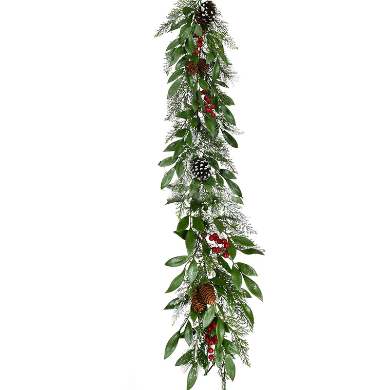 - DESIGNER FINISHES: This modern farmhouse inspired pine and green leaf garland trimmed with red berries and pinecones is the perfect addition to your holiday decor. Suitable for indoor or covered outdoor display.