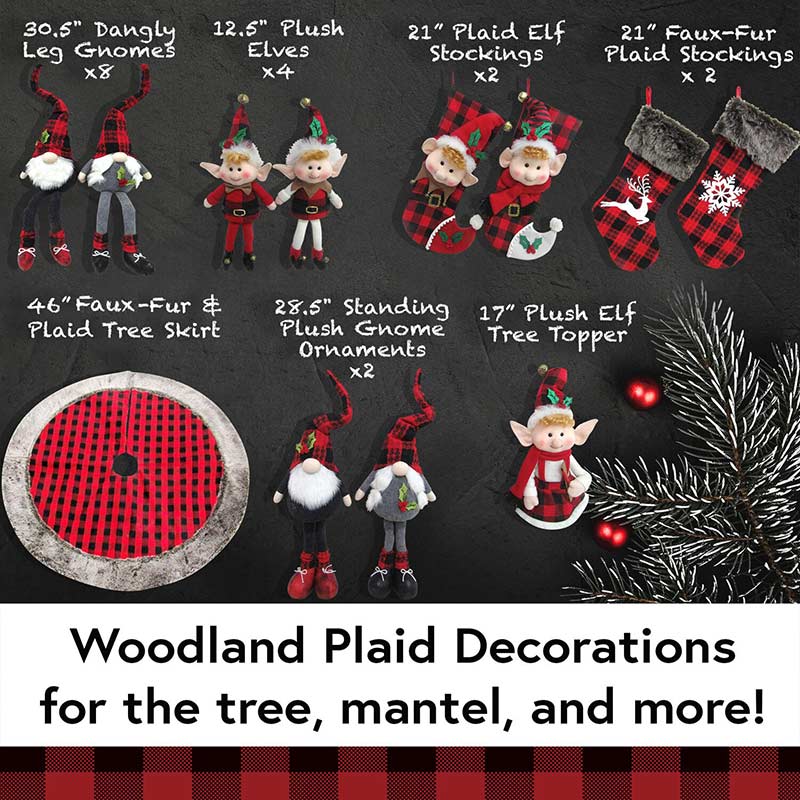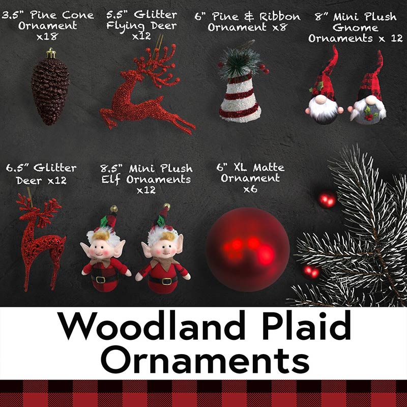 - Curated 182-piece woodland plaid-themed Christmas ornament set for trees up to 12-feet tall (7.5-foot tree included) with plenty more decor for your mantel, door, and floor!