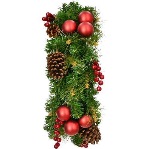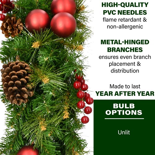 - Crafted of traditional faux pine boughs trimmed with red berries, pinecones, and beautiful red ornaments, this topper is the perfect addition to your holiday decorating.