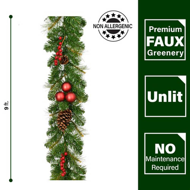 Spruce up your holiday decor with this 9-ft. artificial garland from Fraser Hill Farm. This joyful garland brings all the realistic detail of a live garland with timeless elegance that lasts year after year. Made with flame-retardant and non-allergenic materials, this Christmas classic is the perfect alternative to the real thing. Various green branches are accented with natural pinecones, artificial red berries, and shiny baubles. This beautiful garland radiates a festive spirit, whether you’re decking the halls indoors or out. Drape your new garland over the door, along the banister, or on the fireplace mantle, and welcome each guest with holiday cheer that will last from one season to the next.