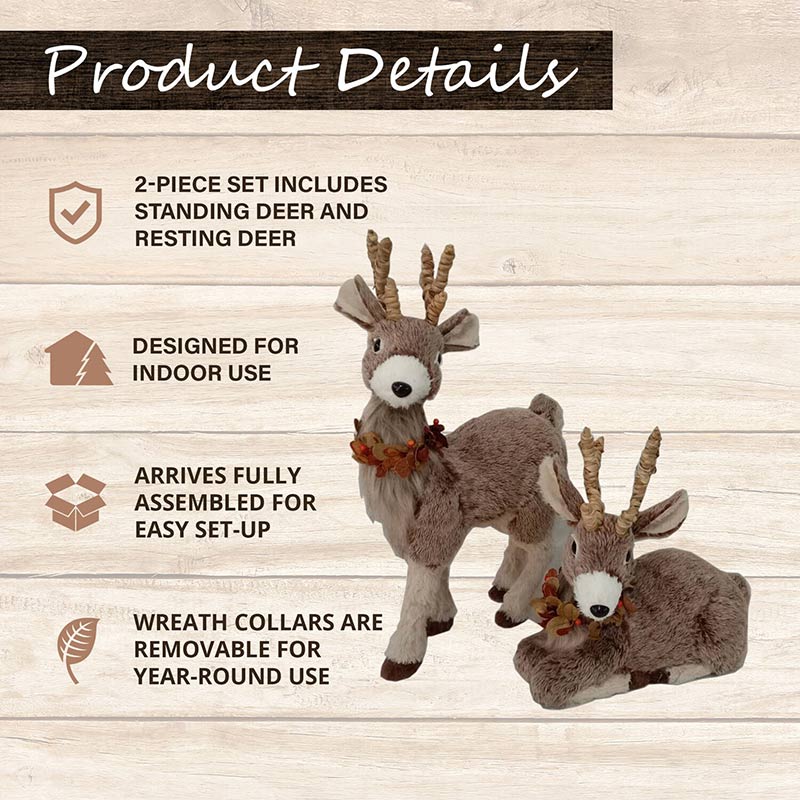 Welcome the autumn harvest or the winter holidays with this versatile 2-piece reindeer set that includes a 23-inch standing deer and a 14-inch resting deer. Place these plush figurines by your fireplace, entryway, or anywhere inside your home to create a festive seasonal display. Your reindeer pair is easy to set up! Simply take them out of the box, and adjust their wreath collars. Let them wear their fall leaf collars to decorate for Thanksgiving, then remove them to decorate for Christmas or year round. At home or at the cabin, your new reindeer pair from Fraser Hill Farm will be the perfect addition to your indoor decor.