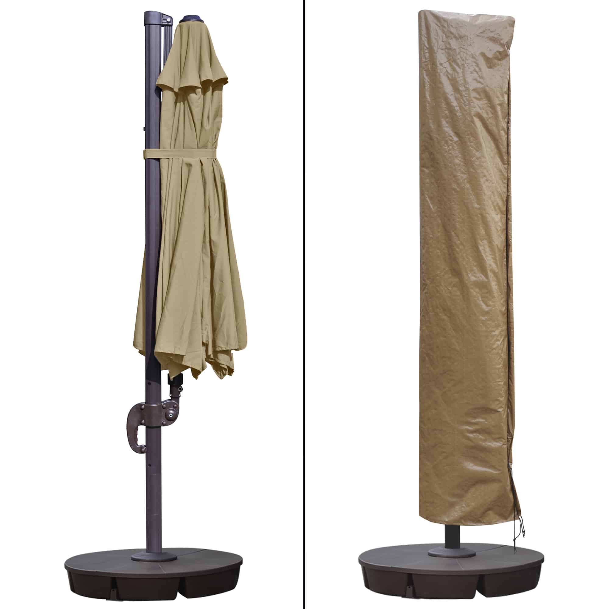 The beautiful resort quality Freeport 11-ft Octagonal Cantilever Patio Umbrella in Sunbrella Acrylic provides 86 square feet of optimal shade without the pole getting in the way of conversations and entertaining. With effortless one-handed crank operation for opening and lowering the umbrella canopy and our patented 360-degree tilt mechanism, you can tilt the umbrella in any number of positions to ensure desired shade from the sun all day long. Its sturdy 2-in offset pole and 8-rib support system are made of aluminum and covered in a rich bronze powder-coated finish for extra protection. The oversized commercial grade canopy is crafted from high-performance durable weather and fade resistant Sunbrella fabric, featuring a single wind vent that allows air to escape freely to limit wind damage. The brown rugged high-quality weather-resistant resin base can be filled with up to 225 pounds of sand providing firm anchoring even on the windiest of days. 5 Year warranty on the Sunbrella canopy; 3 Year warranty on pole and umbrella structure.