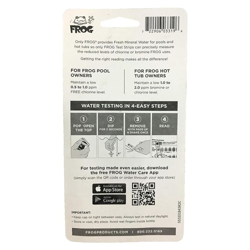 The Bottle of 50 FROG Test Strips is a convenient tool for ensuring your pool water remains balanced and safe. Each bottle contains 50 test strips, designed to provide quick and accurate readings of your pool’s chemical levels. These strips are easy to use; just dip one into the pool water and compare the results to the included color chart. Regular testing helps you maintain the ideal water balance, promoting a clean and healthy swimming environment. Trust FROG Test Strips for reliable pool water monitoring.