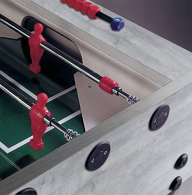The Garlando G-500 Grey Oak Foosball Table combines an elegant look of grey Oak with excellent stability and playability. The 1-inch thick MDF cabinet has a grey Oak color melamine coating providing a furniture look and protection against scratches and dings. Heavy duty 4″ x 4″ metal legs are coated with anti-scratch powder-varnish providing stability and great looks. The playfield is a plastic laminate with green background and white lines to look like a soccer field. Telescopic rods are made of 2/3-inch high stress resistant steel and coated with anti-rust chromium-plating. Steel ball bearings greatly improve the game speed while reducing stress on the player’s wrists. Red and blue players are made of unbreakable plastic and are molded onto the rods. Ball returns are placed conveniently behind each goal to provide quick and easy ball recovery.