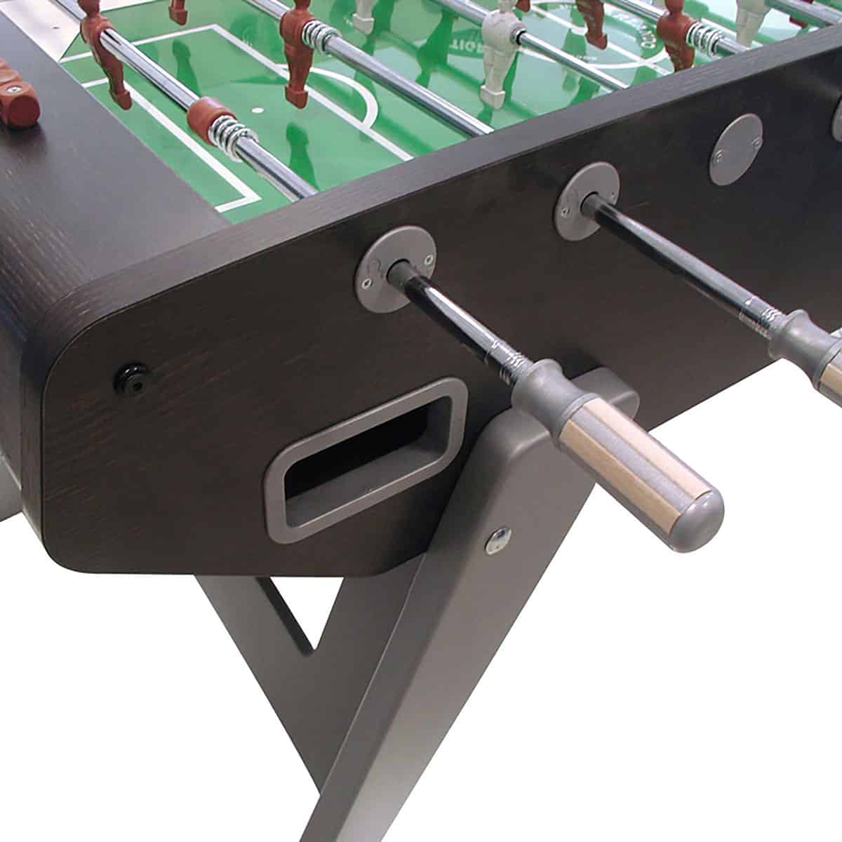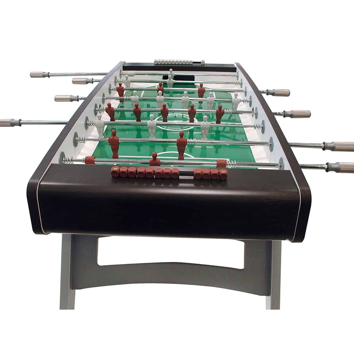 The Garlando G-5000 Foosball Table is the top-of-the-line non-coin operated model. This table is constructed with the highest quality materials to ensure years of competitive play. The table has 1 1/2- inch thick cabinet walls with a plastic laminate finish to keep the finish looking great for years. The playing field is a plastic laminate with green background and white lines to look like a soccer field. 1 1/2 – inch thick, lacquered beech wood legs are slanted to provide great stability. Telescoping rods are made of 2/3″ diameter stress resistant steel with an anti-rust chromium-plating. Steel roller bearings improve game speed while reducing wrist stress. Grey and brown players are made of unbreakable plastic that are molded onto the bars. Professional plastic handles with wooden inserts are designed to reduce perspiration and improve grip. Other features include inside goals coated with felt material to reduce noise and prevent ball chipping and bouncing off, easy quick ball retrieval through returns on both sides of the cabinet, and leg levelers to provide a perfectly flat playing field. Includes 10 standard white balls.