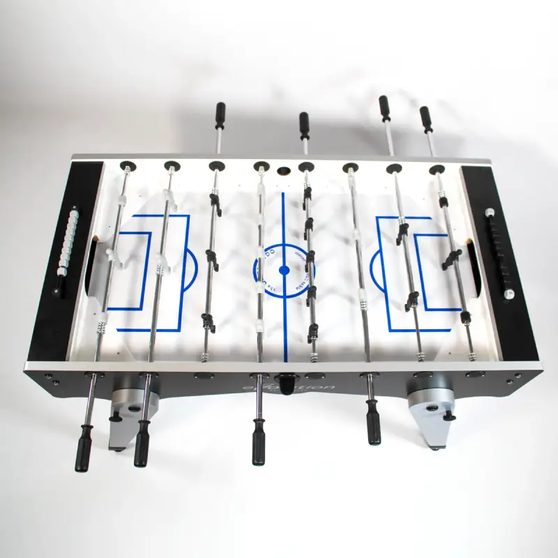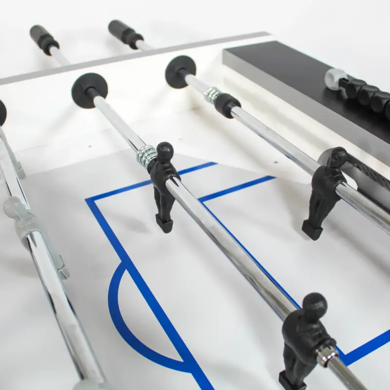 The Garlando Foldy Evolution Indoor Black Foosball Table delivers professional-grade playability in a sleek, space-saving design that perfectly balances form and function. Crafted in Italy, this table features a 1″ thick MDF cabinet with a durable black and silver melamine finish that resists scuffs and fingerprints while maintaining a modern, high-end aesthetic suitable for homes, offices, and recreation spaces. Its signature feature—a foldable leg system with integrated locking supports—allows players to easily store the table vertically without compromising structural integrity, making it an ideal choice for those with limited space. Heavy-duty 2″ steel legs provide superb stability during play, while the integrated leg levelers ensure a perfectly even playing surface on any floor. The tempered glass playfield features vibrant field markings that resist fading and wear, while telescopic steel rods with rust-resistant chromium plating and self-lubricating bushings deliver smooth, lightning-fast action with minimal wrist strain.