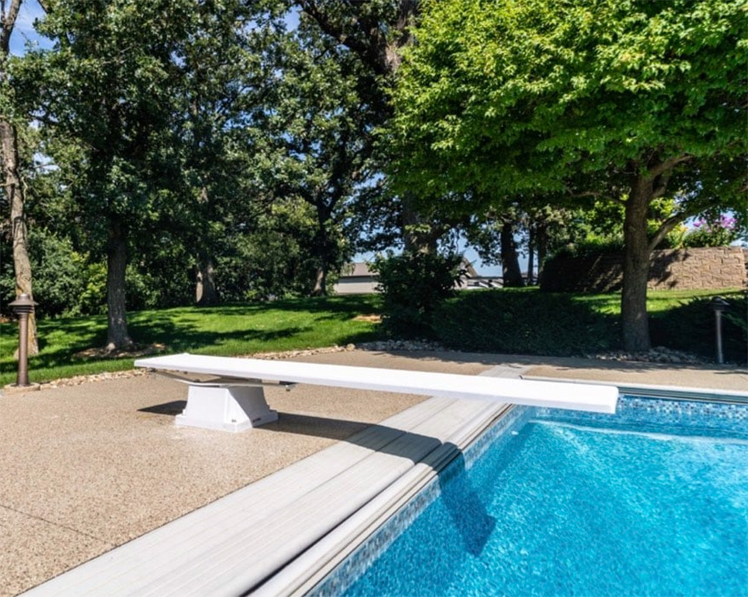 The board features a non-slip, sanded tread surface that provides excellent traction, even when wet. This added grip helps increase confidence during approach and takeoff, making the GX a solid option for families and recreational divers alike. The streamlined profile offers a clean, traditional look that complements a wide range of pool designs, from classic backyard installations to updated modern settings.