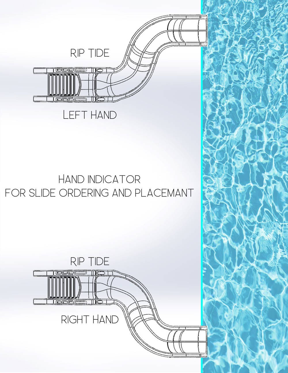 The Global Pool Products Riptide Pool Slide has a clean modern design with fully enclosed plumbing. The ladder is fully enclosed for climbing safety with a center step entry. Riders will feel safe in the wide and deep flume as they zip to the left or right depending on your choice of turn in the slide and get dumbed into the pool. The flowing water makes for an exciting ride! All of our slides are backed by a 3-year limited warranty. Check the product information sheets below for detailed measurements and specifications.