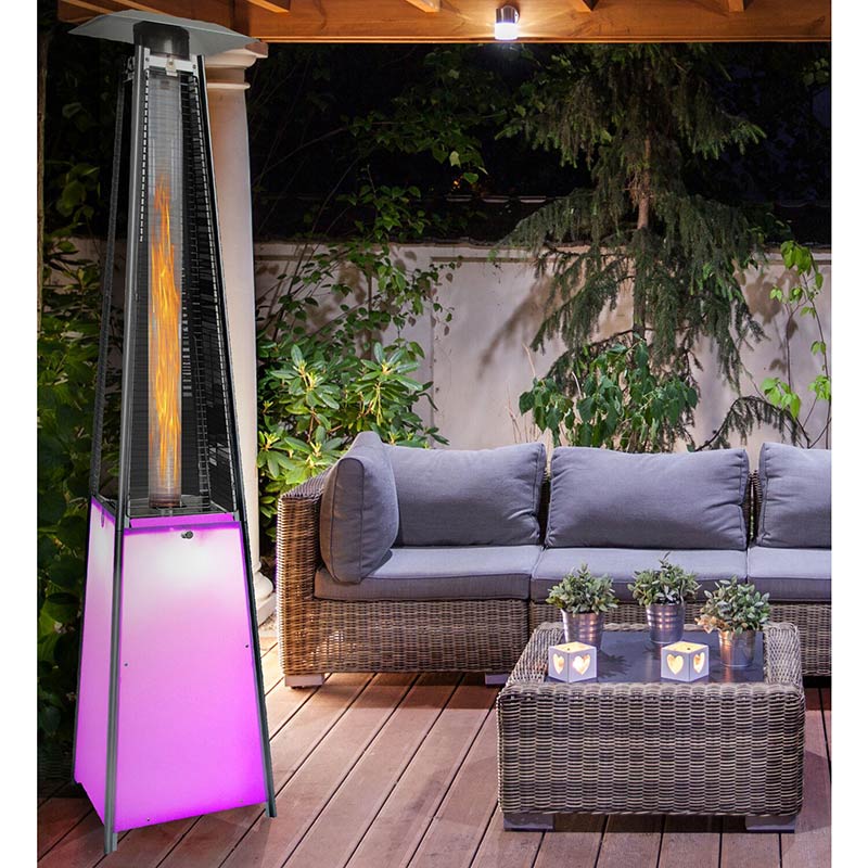 Hanover 7′ Tall, 42,000 BTU LED Color Changing Pyramid Flame Glass Propane Patio Heater Features: