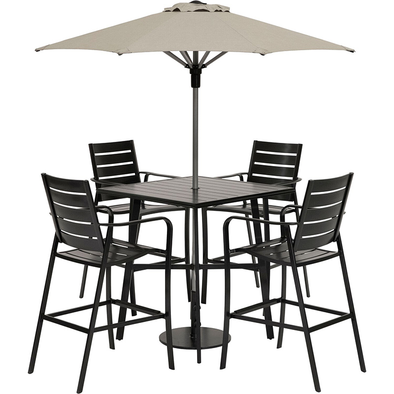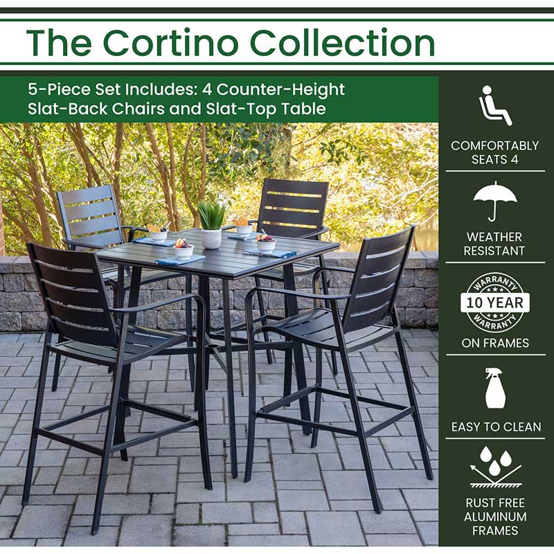 - COMMERCIAL GRADE: The Cortino Dining Collection by Hanover includes modern commercial grade furniture designed with all-weather, maintenance-free materials that are built-to-last years of regular use outdoors. This dining set includes 4 stylish aluminum slat counter-height chairs and your choice of 38-inch square slat-top counter-height table or slat-top counter-height table with umbrella combo made with premium Sunbrella fabric. Perfect for furnishing hotel landscapes, restaurant patios, and residential use.