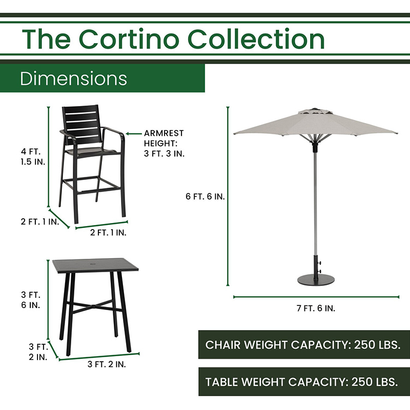 - DINING SET DIMENSIONS: Overall Chair Dimensions: 59.52″H x 25.19″L x 24.8″W, Chair Weight Capacity: 250 lbs., Table Dimensions: 41.85″H x 37.87″L x 37.87″W, Umbrella Dimensions: 7.5′ Diameter, 6.5’H, Umbrella Base Dimensions: 13.77″H x 19.86″L x 19.68″W, 50lbs.