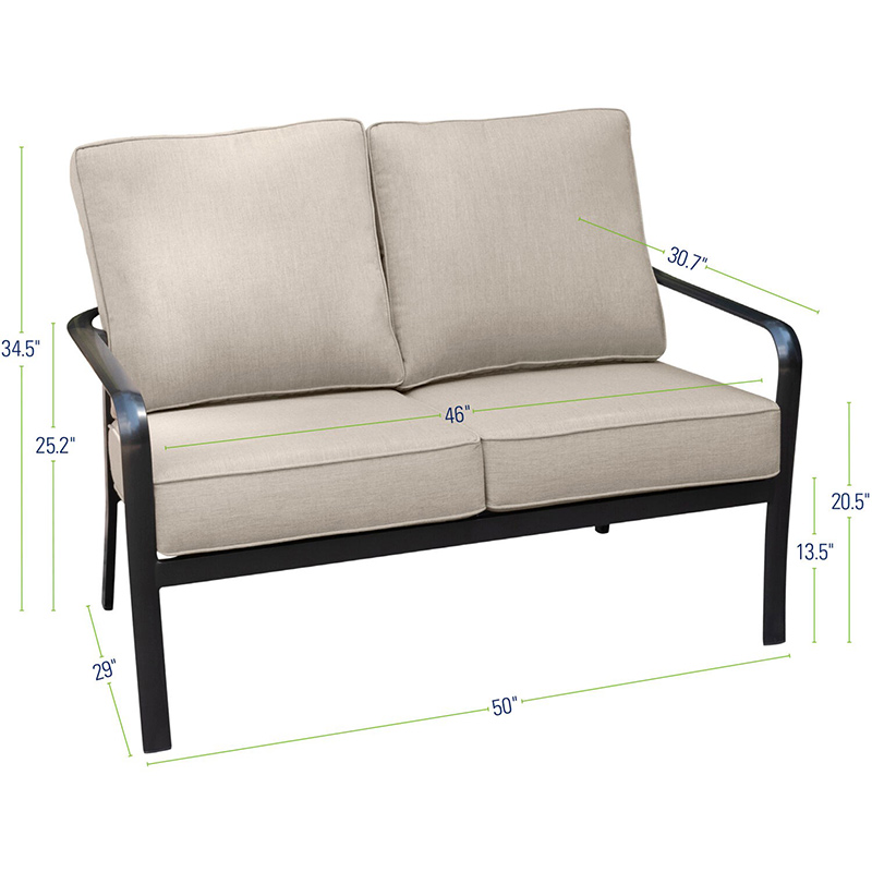 - Sloped-seat design, topped with cushions, allows you to sink into long-lasting comfort