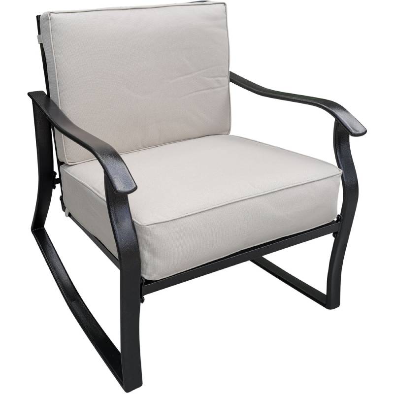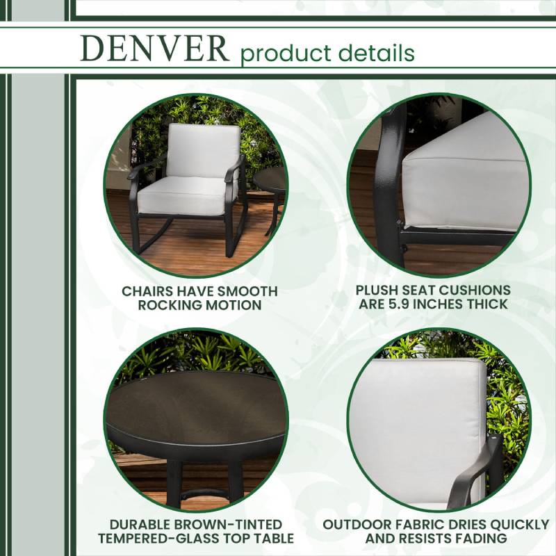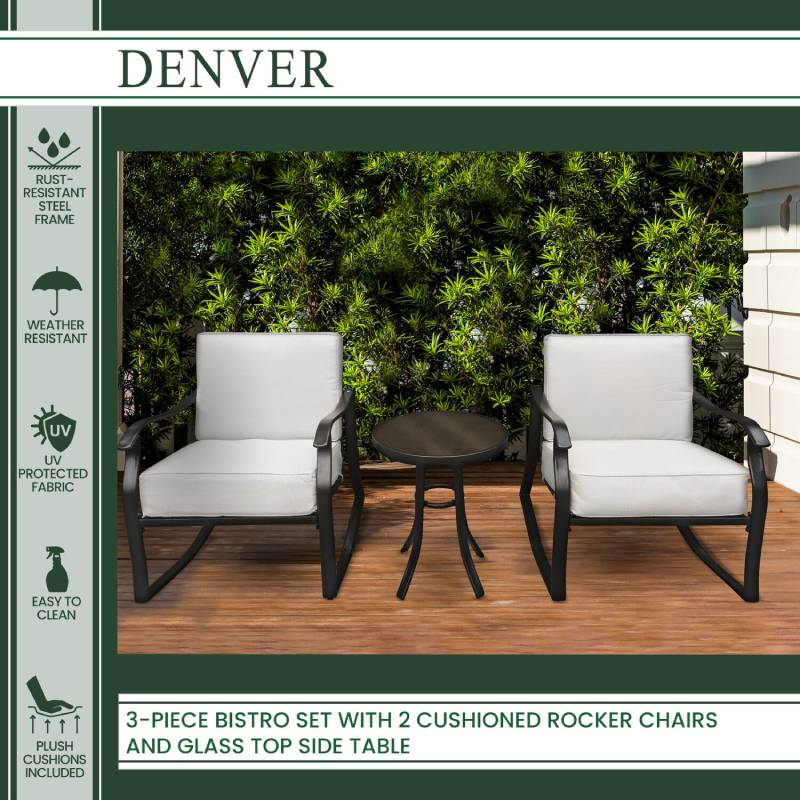 Instantly create an intimate conversation space with the all-weather Denver 3-Piece Rocker Chat Set by Hanover. This set features two deep-seating rocking armchairs and a coordinating end table. Each piece is crafted with heavy-duty steel frames. This sophisticated construction is well coated to be all-weather and rust-resistant during the toughest weather conditions. Both chairs offer a gentle rocking motion and have plush, thick cushions and back pillows for maximum comfort. The cushions are quick drying and the interior foam maintains its shape.