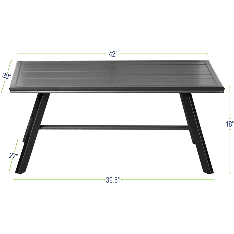 - Includes 2 sling lounge chairs, a sling loveseat, and a 30″ x 42″ slat-top coffee table