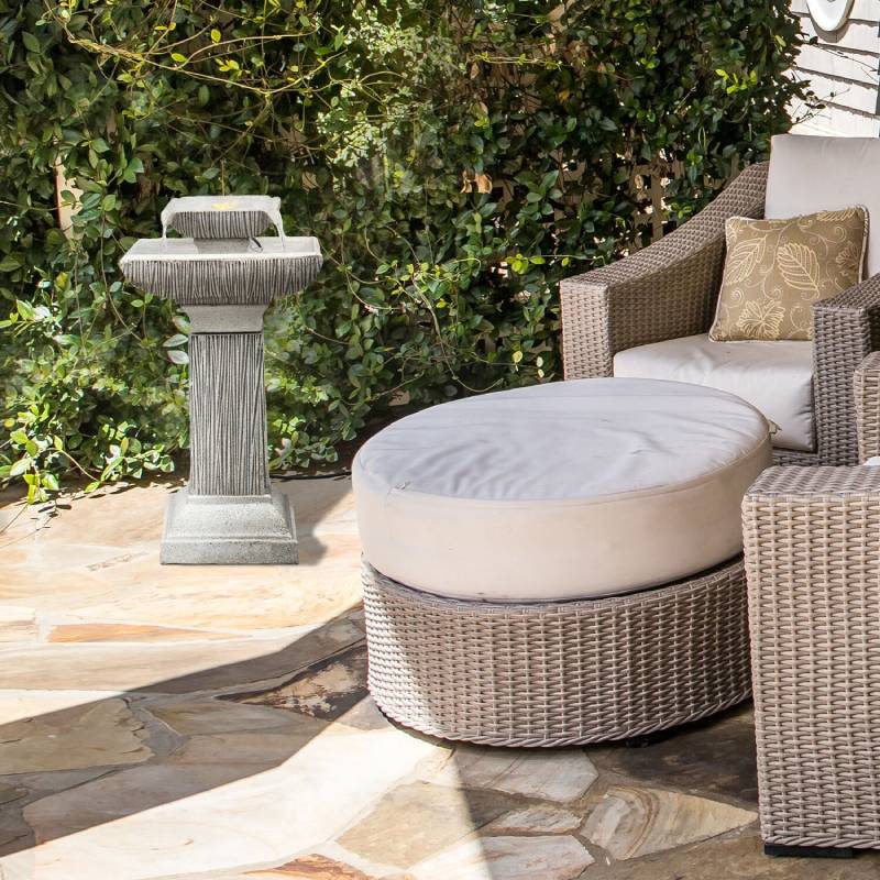 - Constructed with weather-resistant polyresin, this outdoor water fountain is made for you to enjoy in your beautiful courtyard, deck, porch, or balcony, year after year.