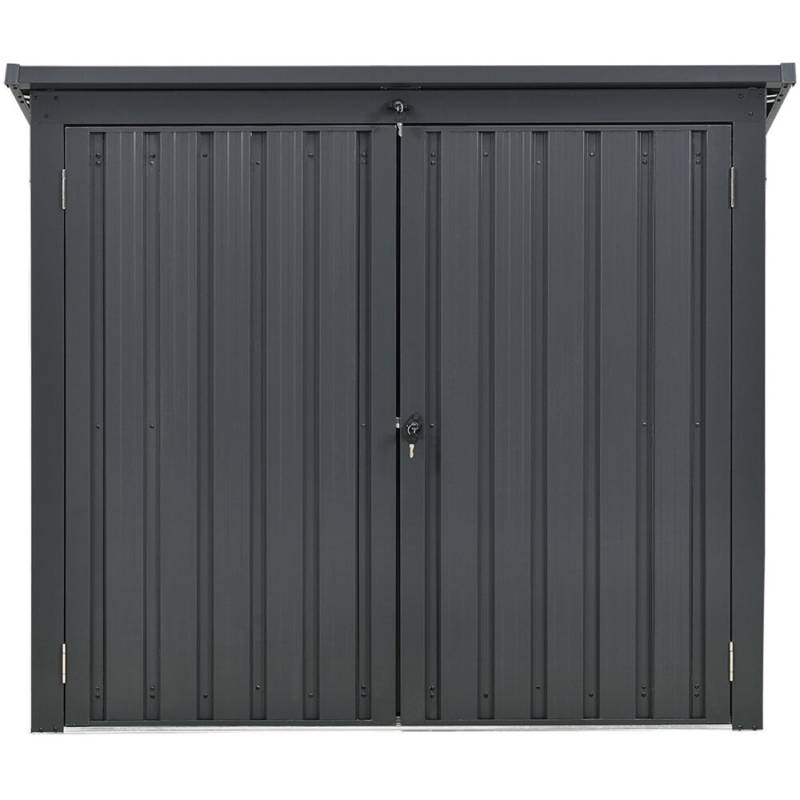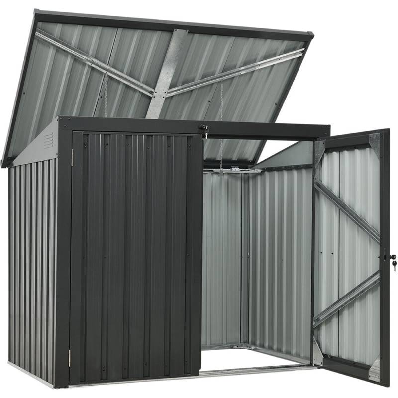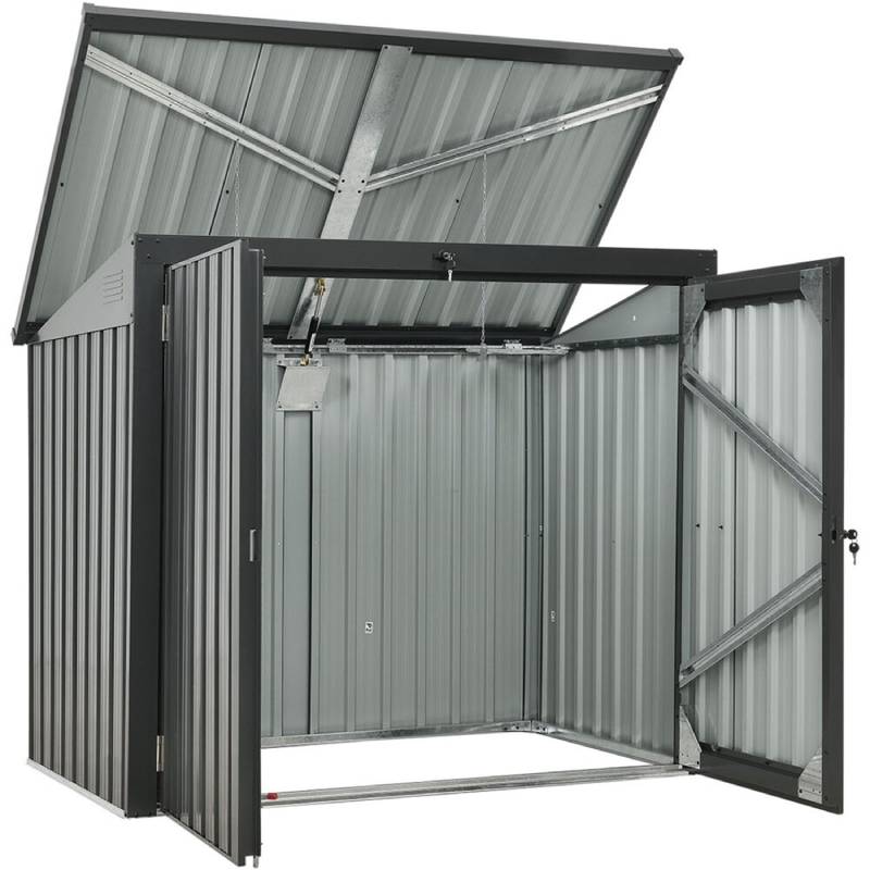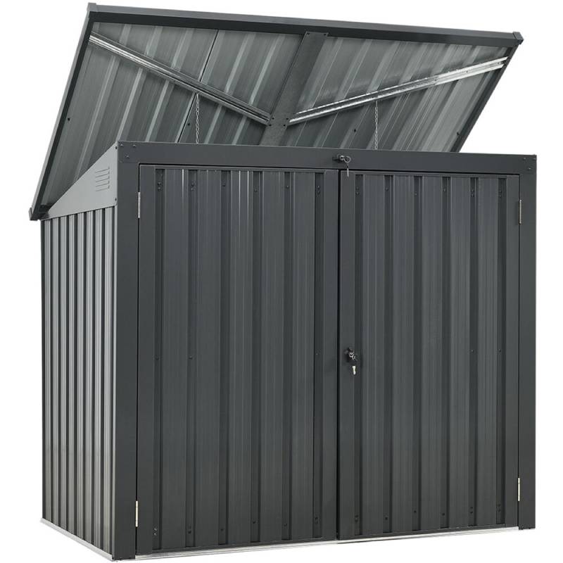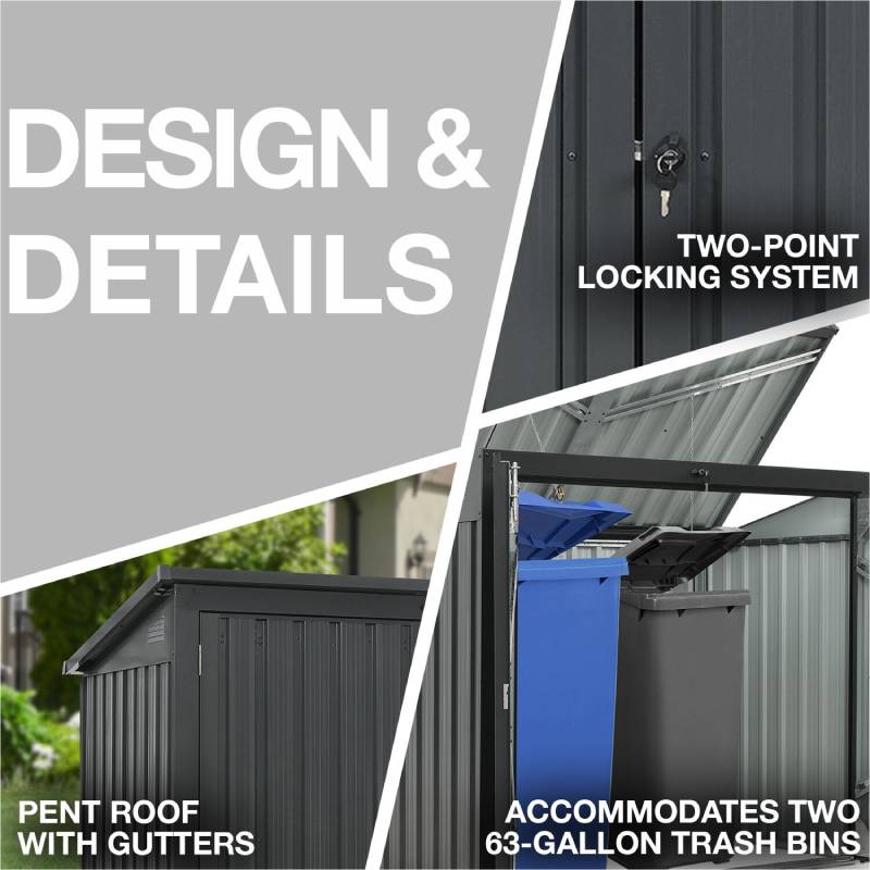 - Low-profile trash and recyclables shed keeps outdoor pests out of the garbage. Accommodates up to two 63-gallon trash/recycle bins no taller than 42 inches.