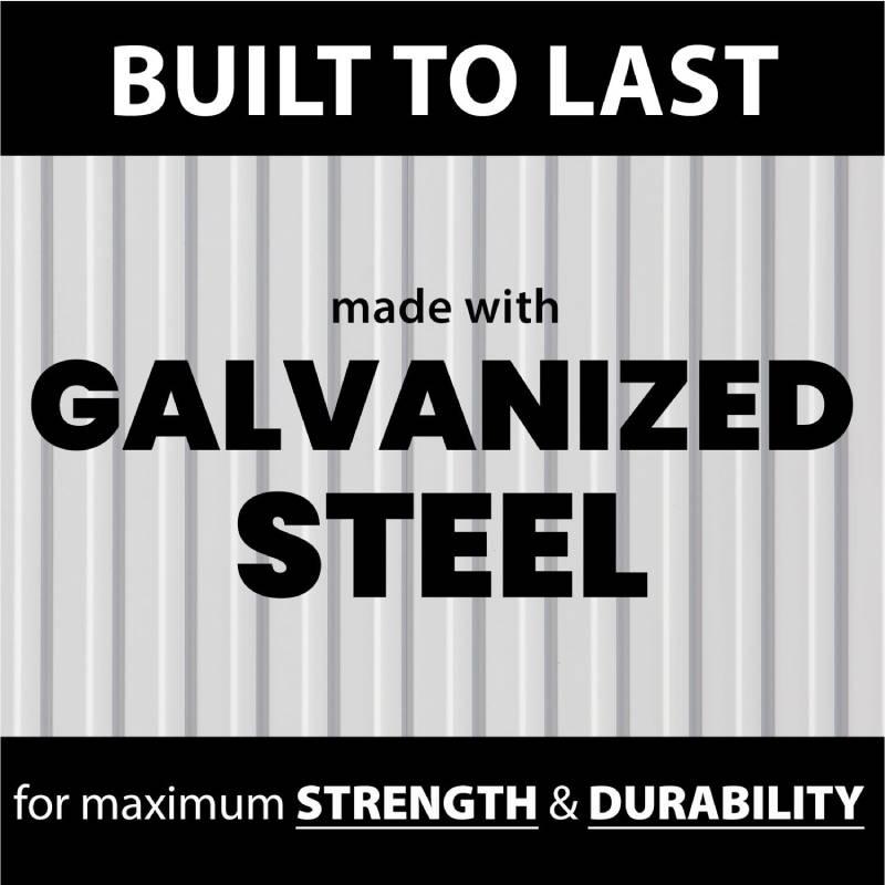 - Storage unit is made of galvanized steel built to last outside year round – rust, rot, fire, and water resistant.