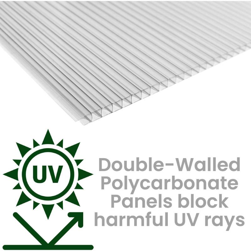 - Double-walled polycarbonate panels block harmful UV rays (0.2 inches total thickness)