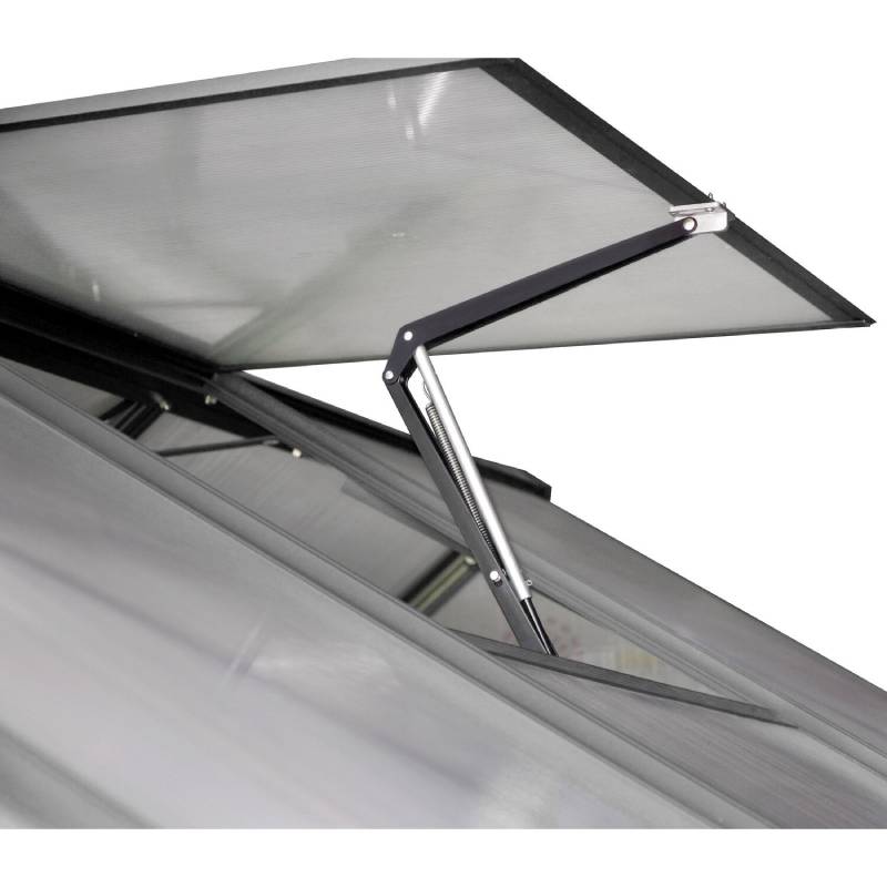 - Sliding door for easy access, rooftop vent with automatic opener for effortless ventilation, plus apex roof and exterior gutters for efficient water and snow runoff (bears up to 100 lbs. snow weight).