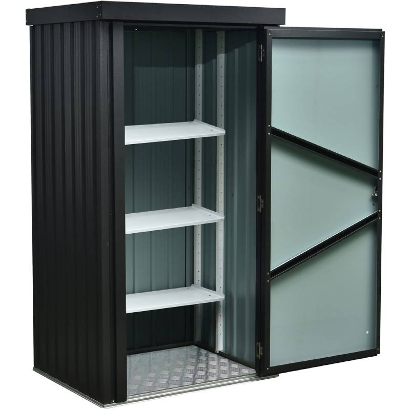 - Patio storage shed includes 3 shelves to maximize space and a full floor