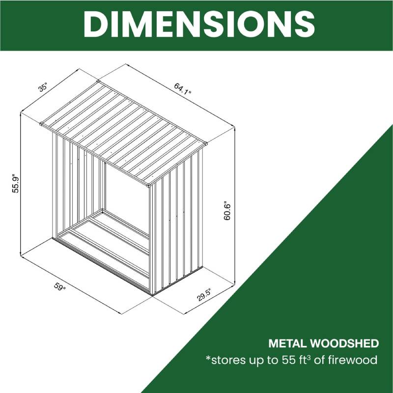 - 27.5″ D x 57″ W x 55″ H interior dimensions / 35″ D x 64″ W x 61″ H exterior dimensions – Stores up to 55 cu. ft of stack firewood!