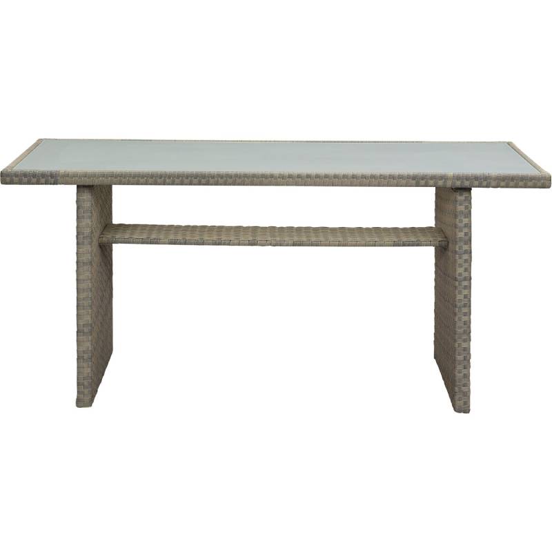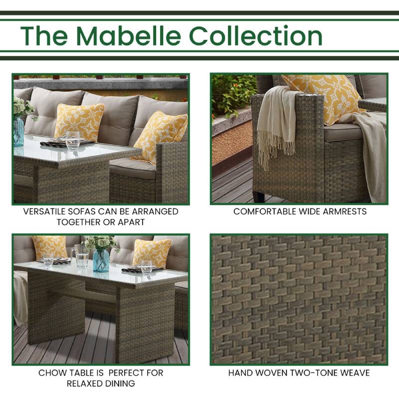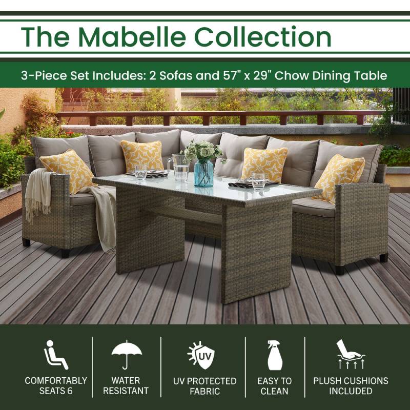 Upgrade your outdoor space with this Mabelle 3-piece sectional conversation set from Hanover. Adaptable to your yard, balcony, porch or patio, these two modular sofas can be positioned together or apart to accommodate larger parties or intimate get-togethers. The pieces can function as a wrap-around sectional or as a pair of sofas with the one-armed sofa doubling as a chaise lounge. Friends and family alike can relax bolstered by comfortable, quick drying cushions and pillows. The sofas are made from two-tone, hand-woven PVC resin, giving you the appeal of wicker but with added durability. Rounding out the set, the chow table bridges the gap between coffee table and dining table—it’s raised height makes it perfect place for a quick bite or casual dinner. It features a white, painted tempered glass top that makes cleanup a breeze. Made with all-weather materials, you’ll enjoy timeless style from the Mabelle collection for years to come.