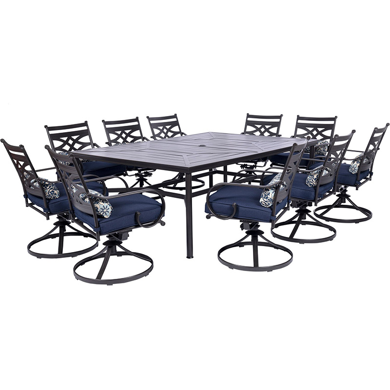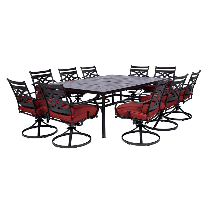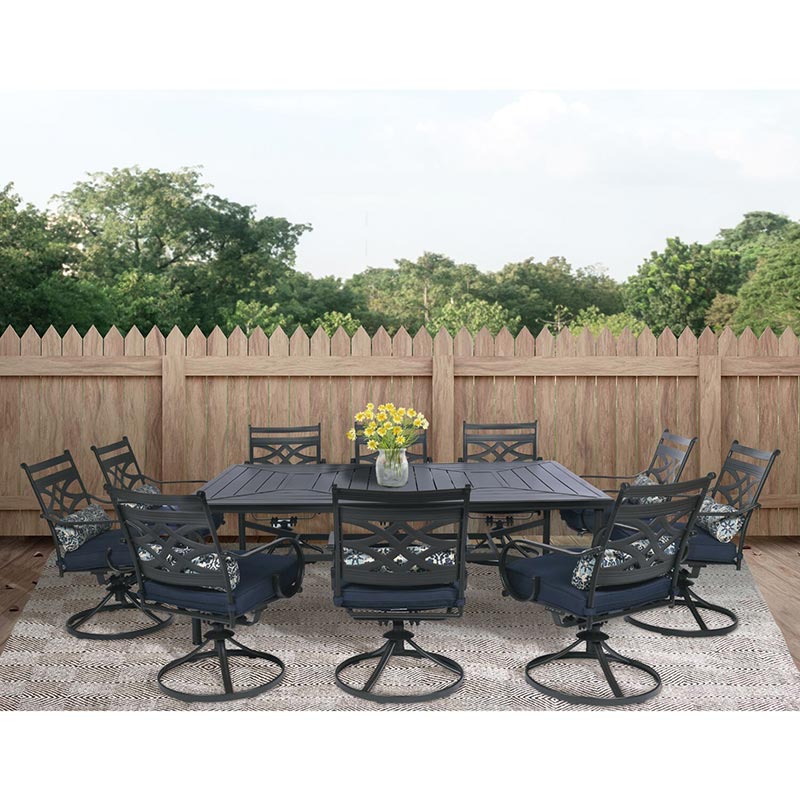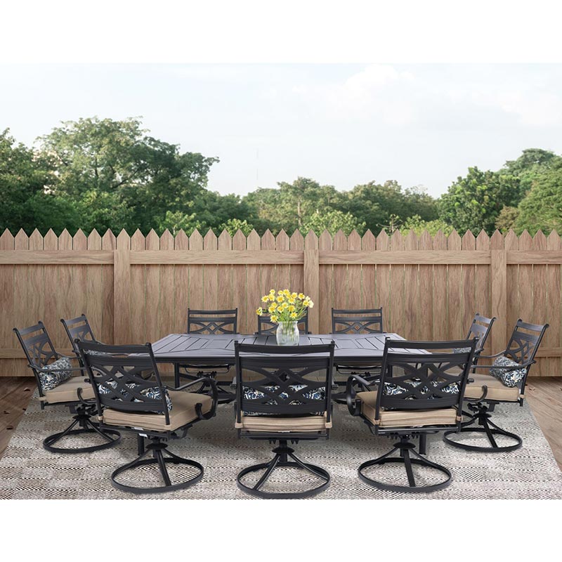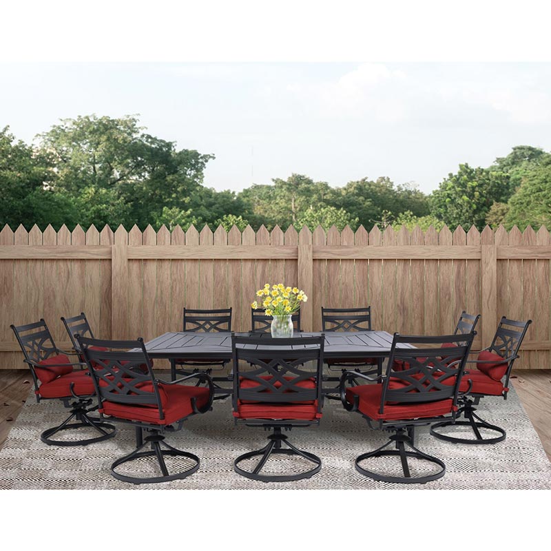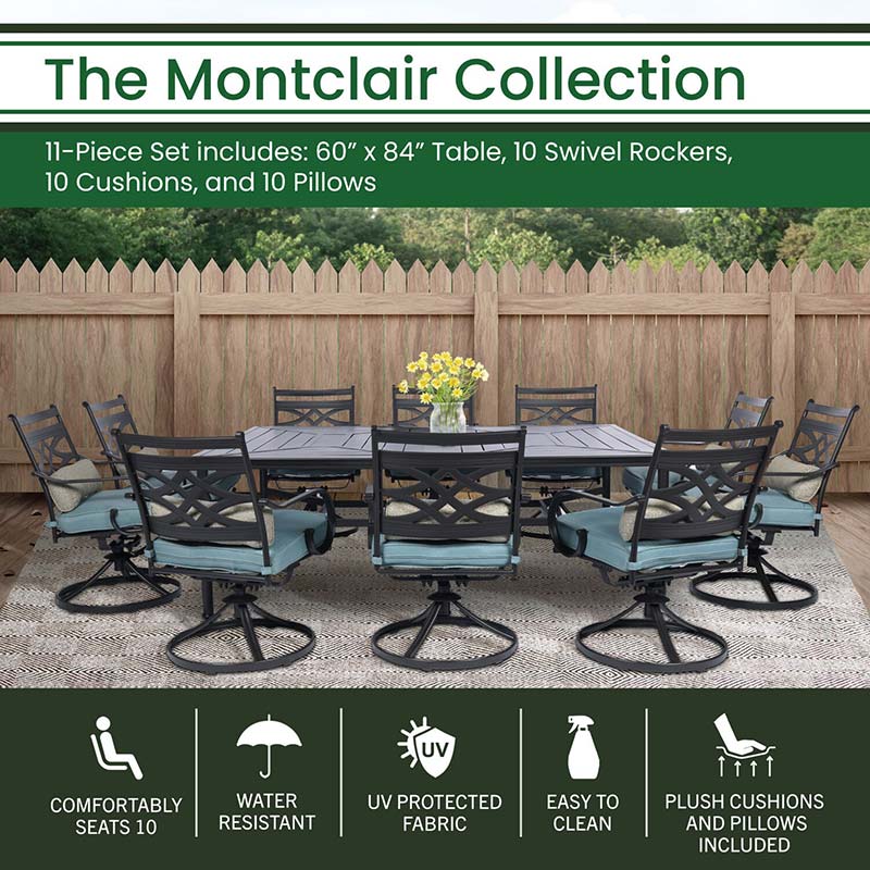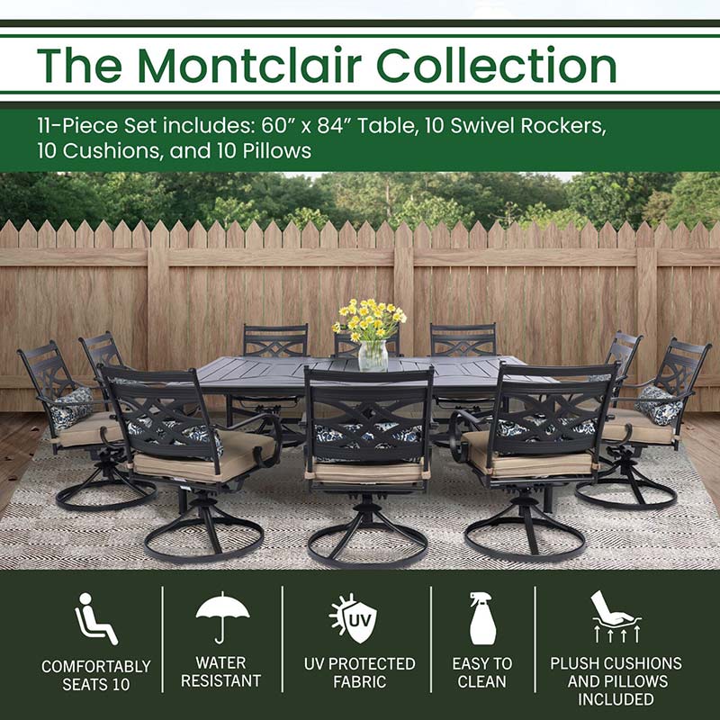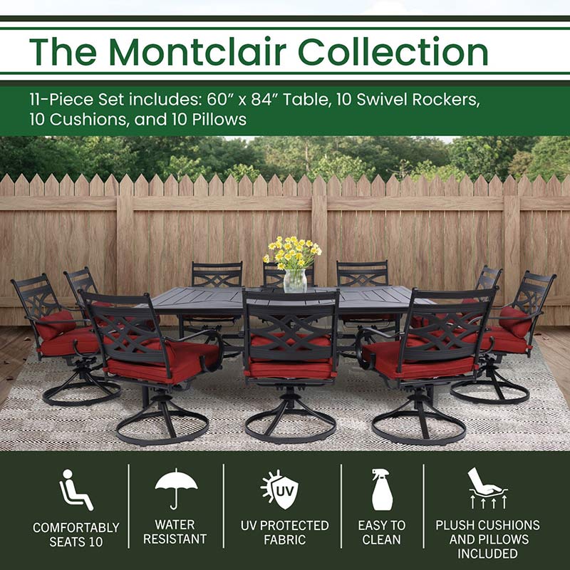 Spend more time outdoors with the Montclair 11-piece patio set from Hanover. This space-friendly dining set includes ten swivel rockers and a 60-in. x 84-in. dining table. The sleek, modern frames are forged out of heavy-duty steel and treated with a multi-step finish for the ultimate outdoor protection. Items within the Montclair Collection are designed to be durable, functional, and timeless. Designer details include curved backrests, elegant curling arms, and swivel-action chair bases that can sweep guests off their feet into a full 360-degree spin. Each chair is topped with thick foam cushions and pillows that allow you to entertain your guests in fashionable comfort. The fabric is soft to the touch, yet durable enough to resist moisture, stains, and UV harm. Entertain in style and comfort all year long with the Montclair Collection.