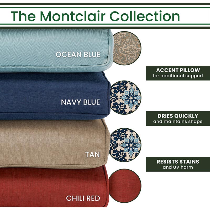 - Cushion color: Ocean Blue, Chili Red, Navy Blue, Tan