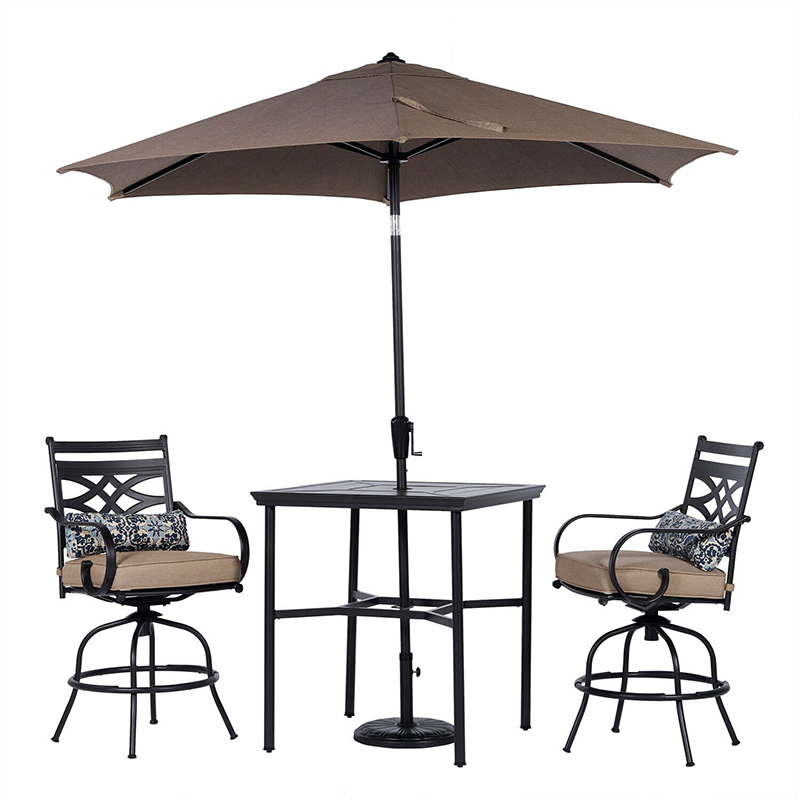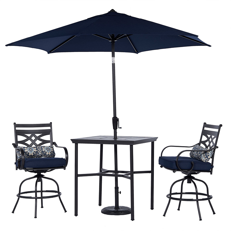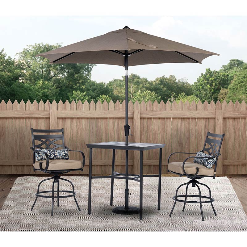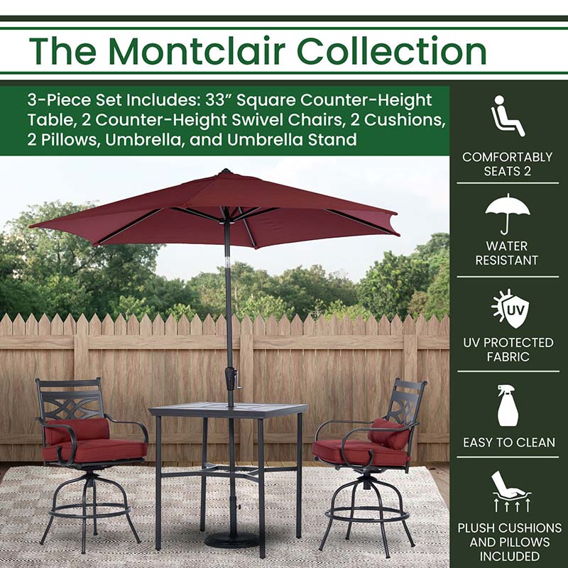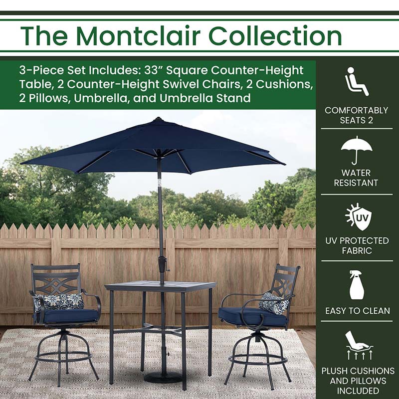Spend more time outdoors with the Montclair 3-piece high-dining patio set from Hanover. This space-friendly dining set includes two swivel chairs, your choice of cushion color: Ocean Blue, Chili Red, Navy, or Tan, a 33-inch square dining table, 9-foot umbrella and umbrella stand. The sleek, modern frames are forged out of heavy-duty steel and treated with a multi-step finish for the ultimate outdoor protection. Items within the Montclair Collection are designed to be durable, functional, and timeless. Designer details include curved backrests, elegant curling arms, and swivel-action chair bases that can sweep guests off their feet into a full 360-degree spin. Each chair is topped with thick foam cushions and pillows that allow you to entertain your guests in fashionable comfort. The fabric is soft to the touch, yet durable enough to resist moisture, stains, and UV harm. Stay cool and comfortable under the sun thanks to the coordinating table umbrella featuring an easy open/close crank and a tilt function so you can adjust the shade. Entertain in style and comfort all year long with the Montclair Collection.