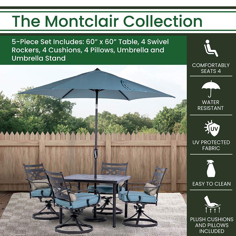 Spend more time outdoors with the Montclair 5-piece patio set from Hanover. This space-friendly dining set includes four swivel rockers with your choice of cushion color: Ocean Blue, Chili Red, Navy, and Tan as well as a 40-inch square dining table with umbrella combo. The sleek, modern frames are forged out of heavy-duty steel and treated with a multi-step finish for the ultimate outdoor protection. Items within the Montclair Collection are designed to be durable, functional, and timeless. Designer details include curved backrests, elegant curling arms, and swivel-action chair bases that can sweep guests off their feet into a full 360-degree spin. Each chair is topped with thick foam cushions and pillows that allow you to entertain your guests in fashionable comfort. The fabric is soft to the touch, yet durable enough to resist moisture, stains, and UV harm. You’ll stay cool and comfortable under the sun thanks to the coordinating table umbrella featuring an easy open/close crank and a tilt function so you can adjust the shade. Entertain in style and comfort all year long with the Montclair Collection.