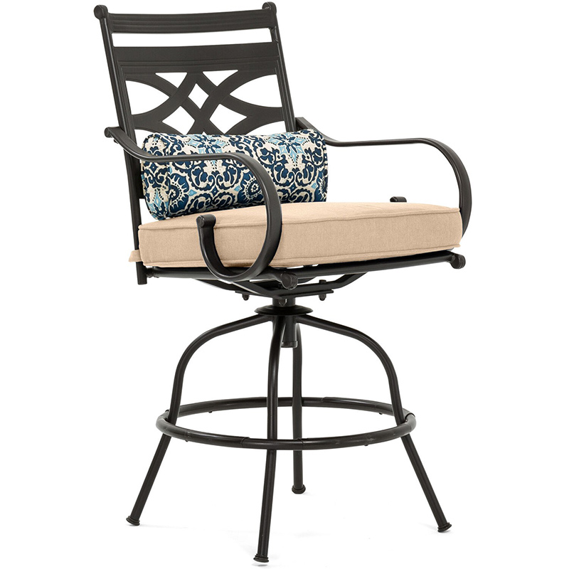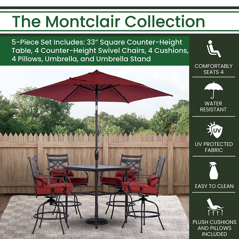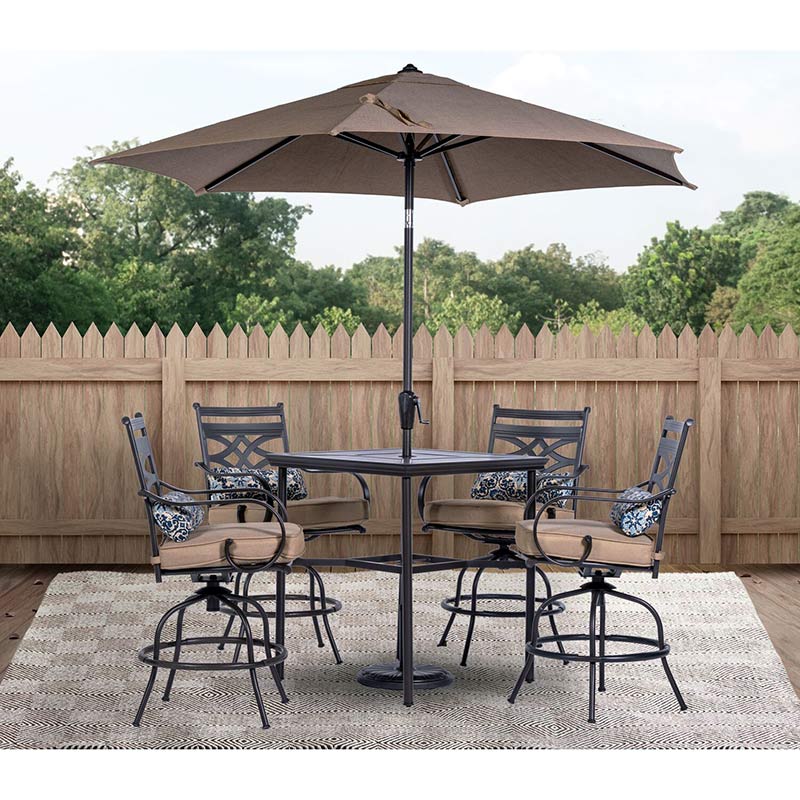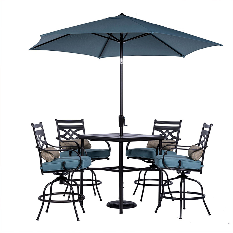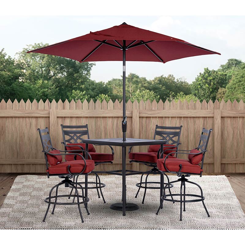 Spend more time outdoors with the Montclair 5-piece high-dining patio set from Hanover. This space-friendly dining set includes four swivel chairs with your choice of cushion color: Ocean Blue, Chili Red, Navy, or Tan and a 33-inch square dining table with umbrella combo. The sleek, modern frames are forged out of heavy-duty steel and treated with a multi-step finish for the ultimate outdoor protection. Items within the Montclair Collection are designed to be durable, functional, and timeless. Designer details include curved backrests, elegant curling arms, and swivel-action chair bases that can sweep guests off their feet into a full 360-degree spin. Each chair is topped with thick foam cushions and pillows that allow you to entertain your guests in fashionable comfort. The fabric is soft to the touch, yet durable enough to resist moisture, stains, and UV harm. You’ll stay cool and comfortable under the sun thanks to the coordinating table umbrella featuring an easy open/close crank and a tilt function so you can adjust the shade. Entertain in style and comfort all year long with the Montclair Collection.