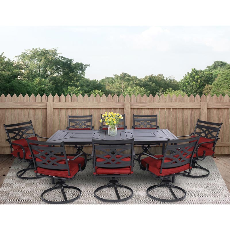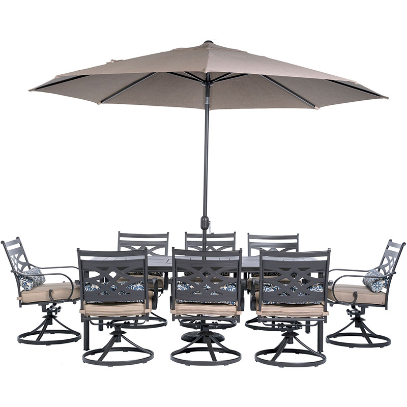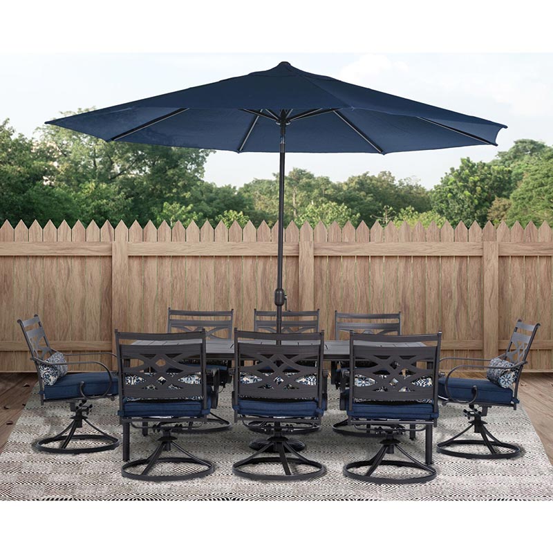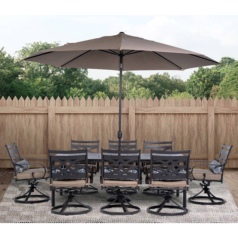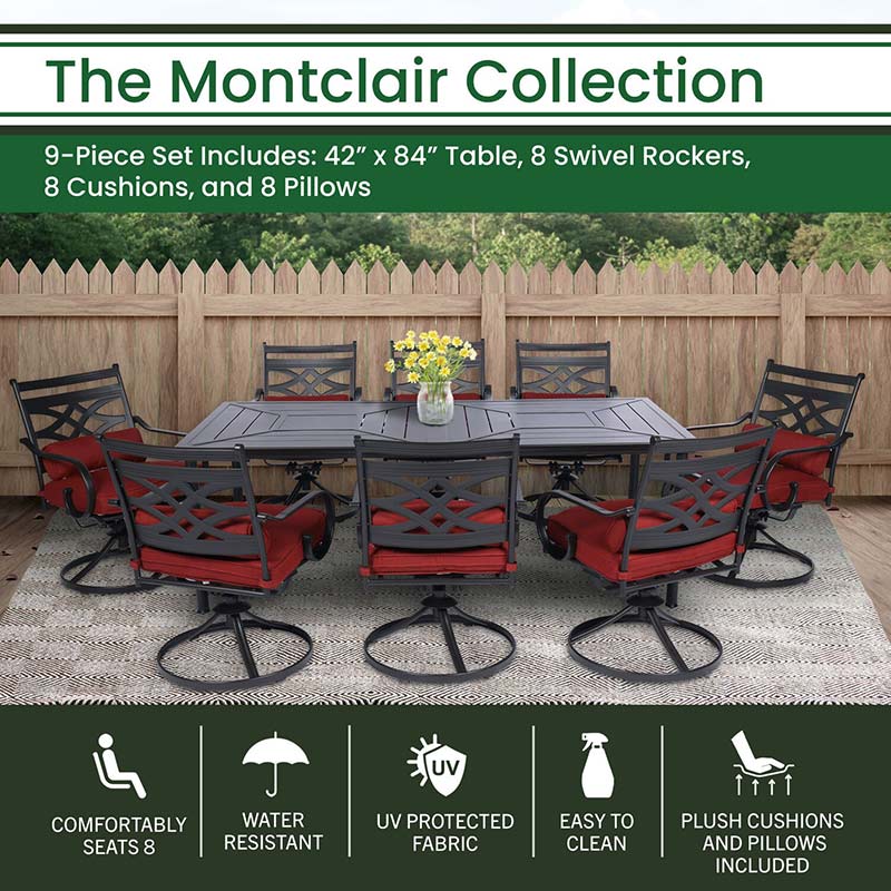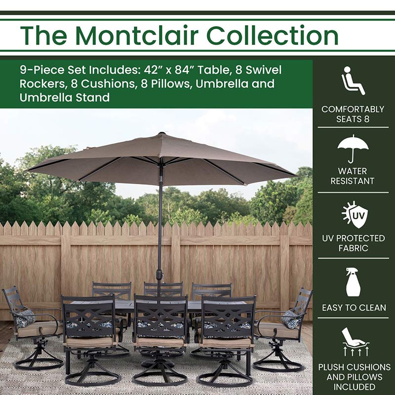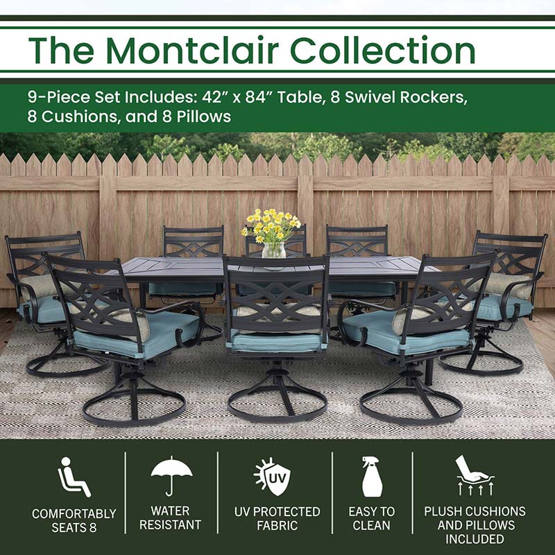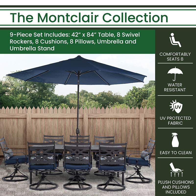 Spend more time outdoors with the Montclair 9-piece patio set from Hanover. This elegant dining set includes eight swivel rockers and a 42-in. x 84-in. dining table with options for a matching 11-ft. umbrella with stand. The sleek, modern frames are forged out of heavy-duty steel and treated with a multi-step finish for the ultimate outdoor protection. Items within the Montclair Collection are designed to be durable, functional, and timeless. Designer details include curved backrests, elegant curling arms, and swivel-action chair bases that can sweep guests off their feet into a full 360-degree spin. Each chair is topped with thick foam cushions and pillows that allow you to entertain your guests in fashionable comfort. The fabric is soft to the touch, yet durable enough to resist moisture, stains, and UV harm. Entertain in style and comfort all year long with the Montclair Collection.
