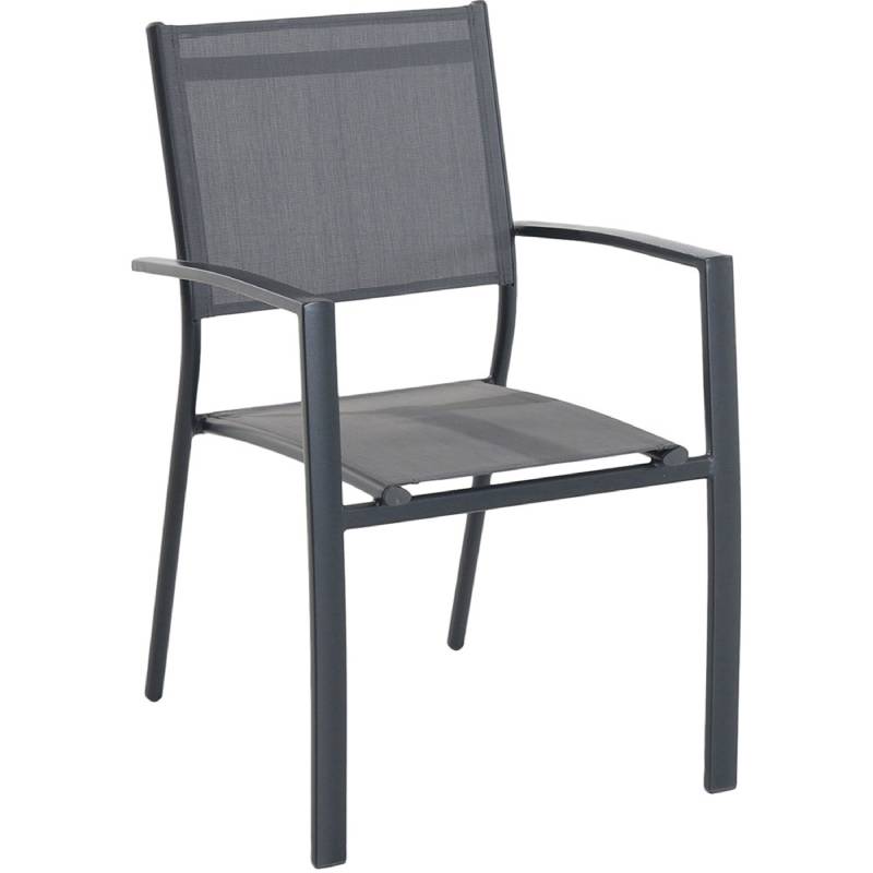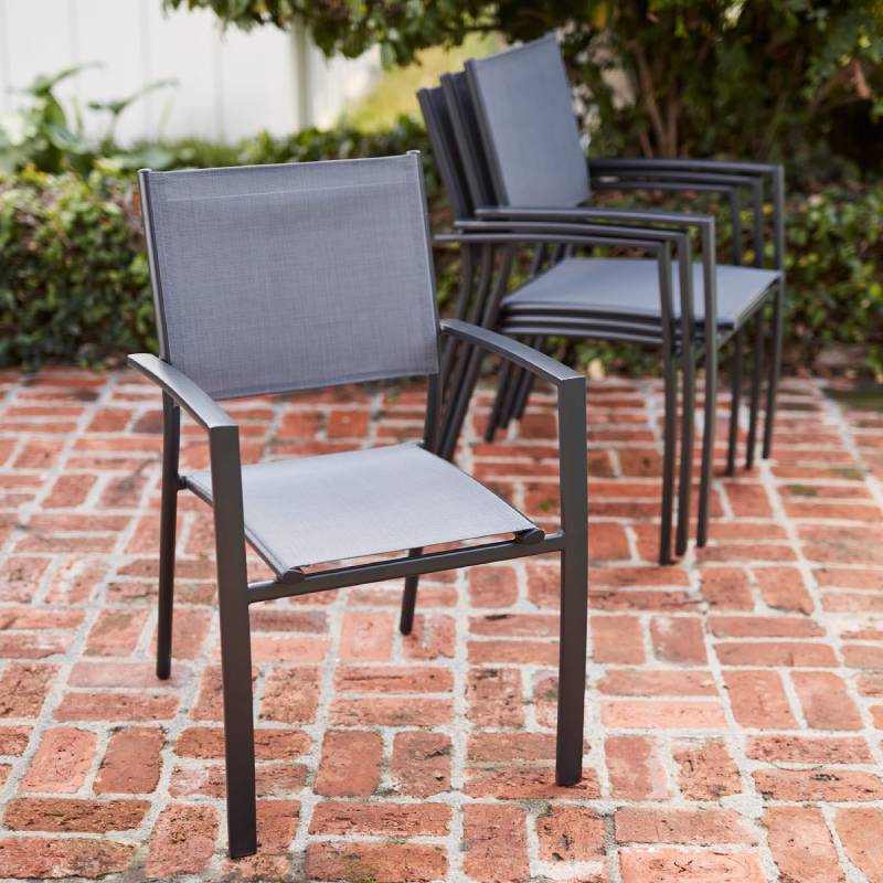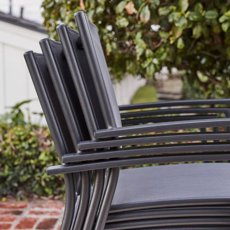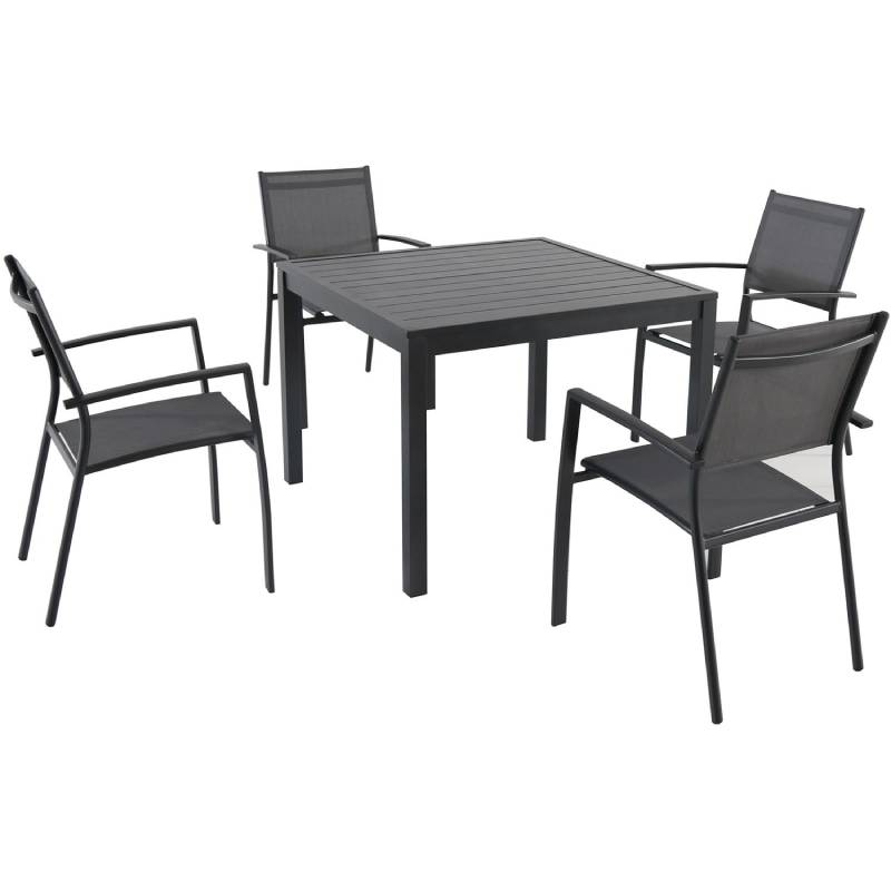 Extend your sense of style outdoors with the sleek 5-piece dining set from the Hanover Naples Collection. This space-saving set includes a modern square table with slat tabletop and four sling-back dining chairs. The cool gray fabric and the matte black frames omit a contemporary vibe that makes a bold statement in any location. When not in use, the dining chairs can stack on top of each other for compact storage. With heavy-duty aluminum frames and a multi-step powder coating, weather and wear are no match for the Naples unprecedented all-weather construction.