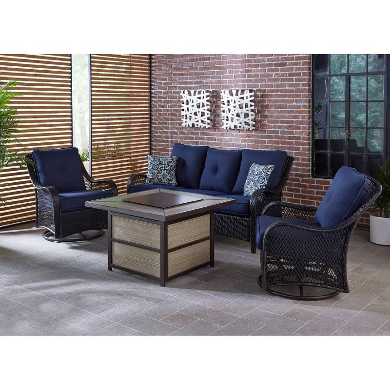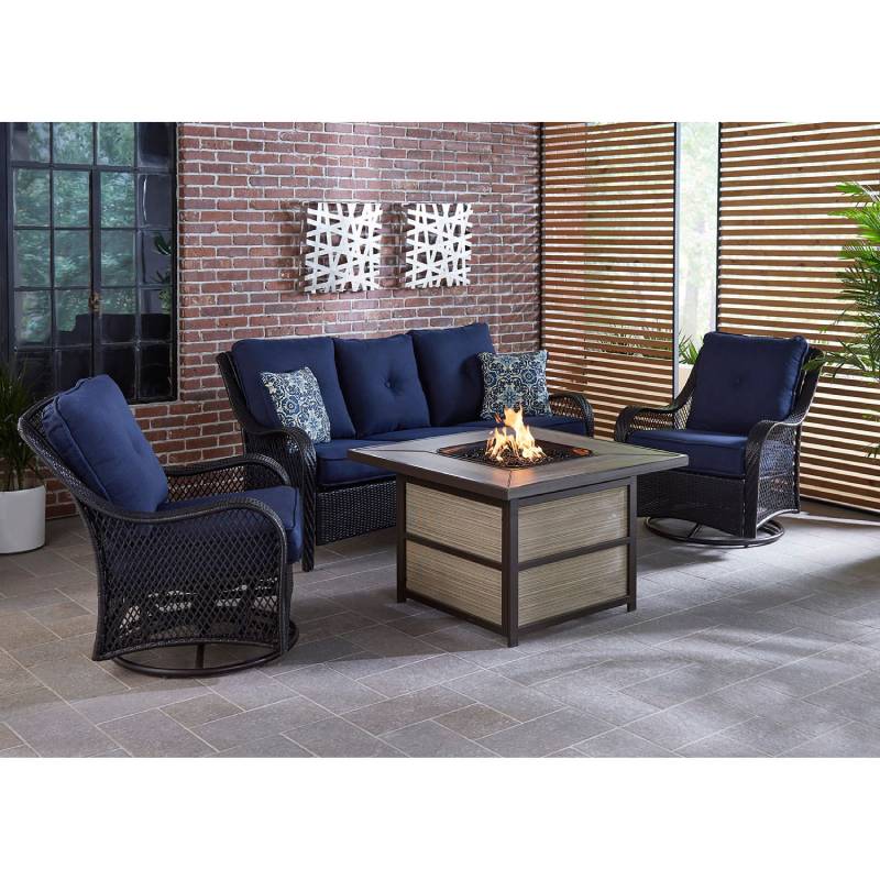 - Set includes one deep-seating sofa, two woven swivel gliders and a 40,000 BTU fire pit coffee table