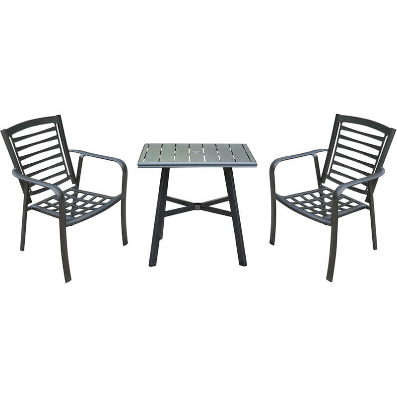 The Pemberton Collection 3-piece bistro set helps bring paradise closer to home with its all-weather construction, impeccable detail, and sophisticated style-suitable for any 5-star resort. This commercial-grade collection is truly built to last and transforms any backyard into an upscale dining area with cool, contemporary vibes. This product gives you the choice of 2 stackable dining chairs or 2 cushioned dining chairs with a 30-inch square tempered glass-top table or a 30-inch square slat-top table. All products are all made with a solid foundation, using rustproof aluminum frames in an all-weather gunmetal finish, designed to withstand the test of time. When it comes time to move the chairs around, they feature a convenient “grab hold” in the backrest for easy lifting, stacking, and unpacking. Perfect for everyday use in commercial and residential settings, treat yourself to top of the line patio furniture from Hanover’s Pemberton Collection.