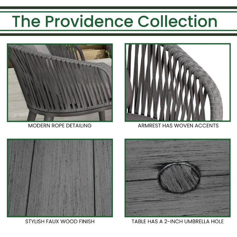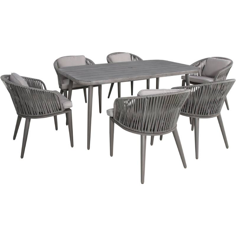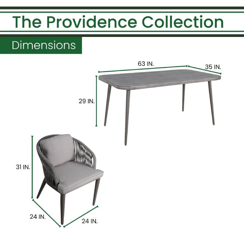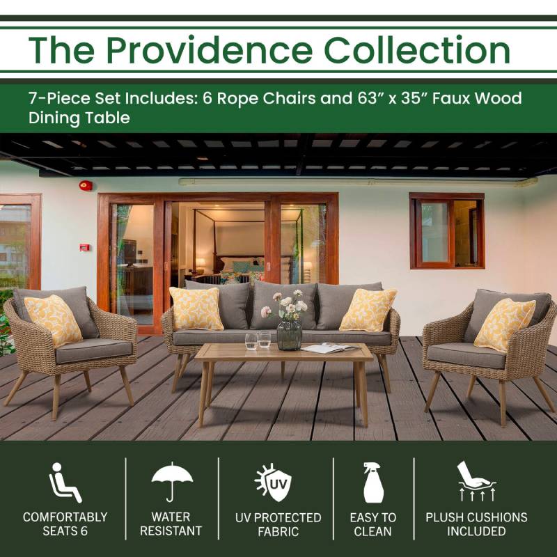 Set the scene for your next outdoor occasion with the Providence 7-piece dining set by Hanover. This classic collection includes six dining chairs and a faux woodgrain slat-top dining table. It boasts mid-century modern details like tapered legs, rope accents, and scoop chairs, but with contemporary benefits like sturdy aluminum frames, covered with a powder coating that extends protection against rust, scratches, and UV harm. Adding comfort to style, the chairs have thick, plush cushions and back pillows that are quick-drying and maintain their shape. Made with all-weather materials, this set will be at the center of all of your outdoor entertaining for years to come.