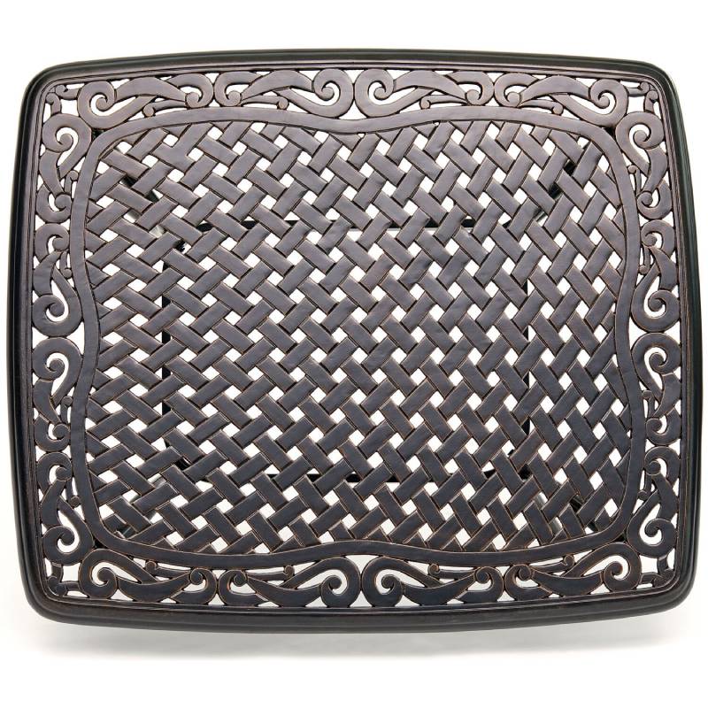 - Cast-top features an ornate lattice and scroll design that prevents water build up on the table’s surface