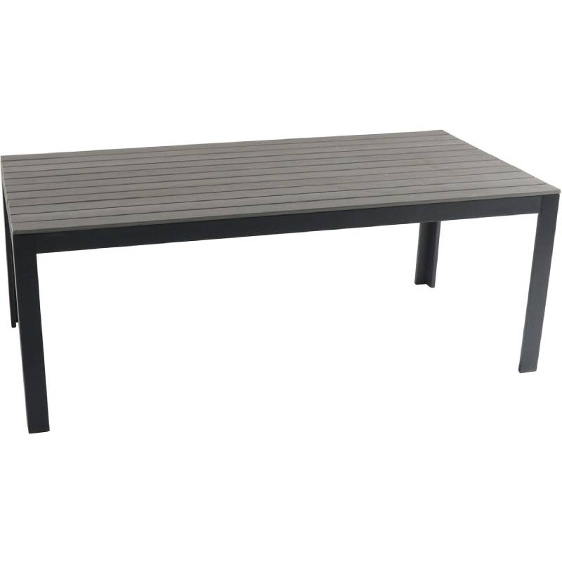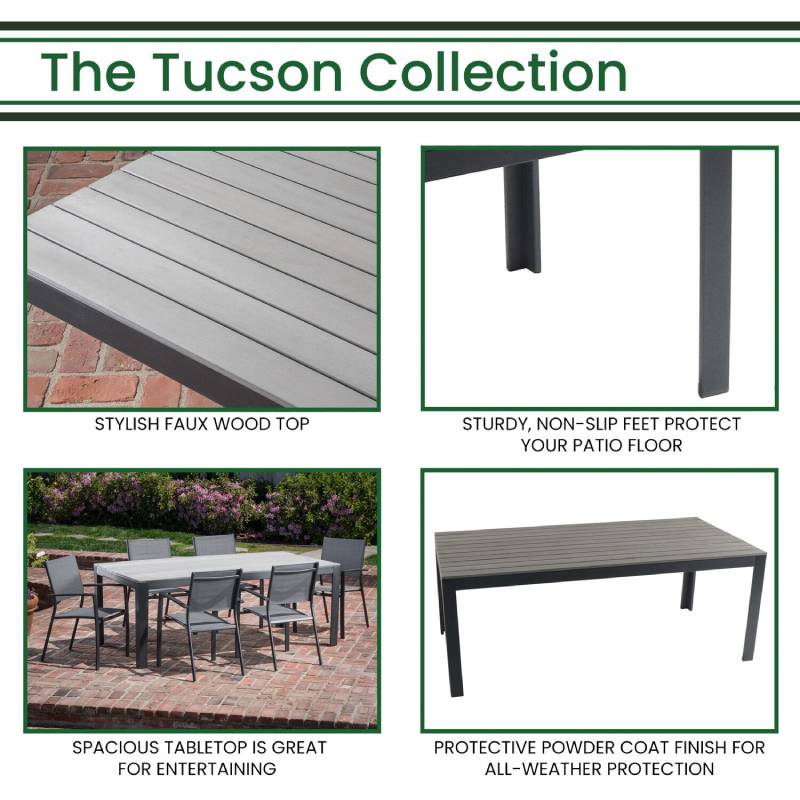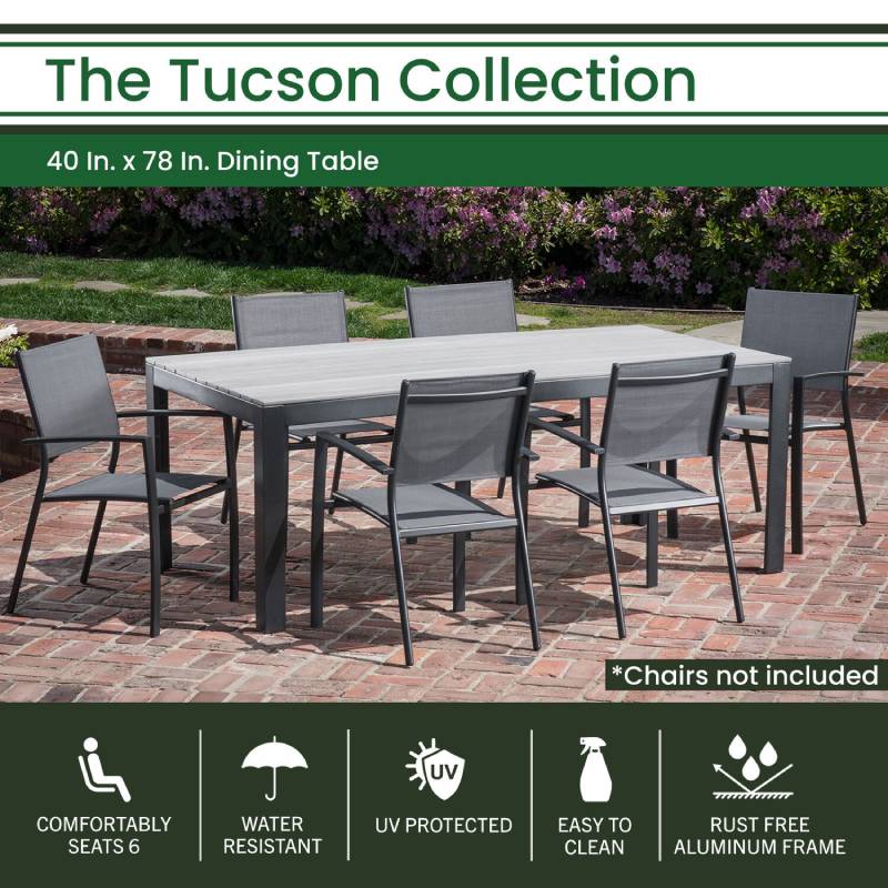 Add a touch of rustic charm to your backyard with the Tucson 40-in. x 78-in. outdoor dining table from Hanover. The cool gray tones omit a contemporary vibe and the faux-wood adds texture to any location. Weather and wear are no match for its premium outdoor construction. The table features a heavy-duty aluminum frame and a durable faux-wood slat top. Make a statement in your outdoor dining area with the Tucson Dining Collection.