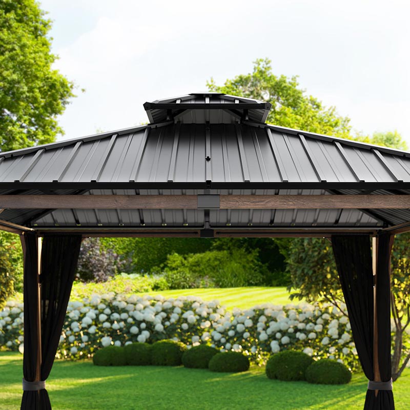 - CLASSIC DESIGN: The Wyatt Outdoor Gazebo was designed to fit any backyard, deck, roof top, or deck. With its warm neutral faux wood and brown tones, this canopy will match any outdoor space. Comes equipped with mosquito netting to keep out any pesky bugs and provide extra shade.