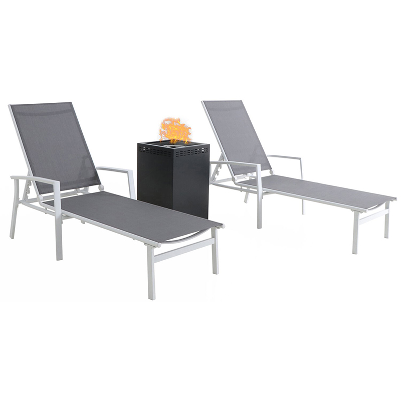 Harper 3 Piece Chaise Fire Pit Set: 2 Alum Chaise Lounges and Glass Top Fire Pit Features: