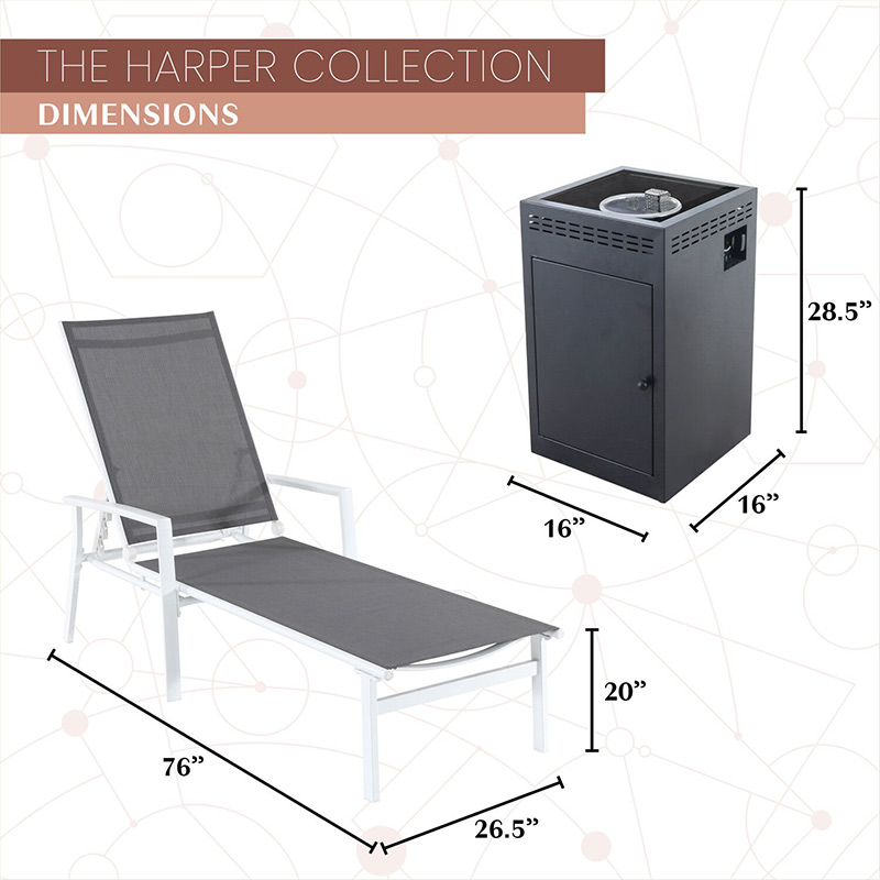 - MODERN STYLISH DESIGN: The Harper Collection by Mod Furniture is the definition of modern design. The white frames and grey sling fabric really make this set unique and will have all of your guests in envy. Our column fire pit with lava rocks rounds out of the set with its compact and easy to use push-button ignition. Perfect set. Perfect set up in any backyard, patio, porch, roof deck, or pool for ultimate lounge time.