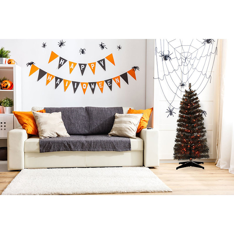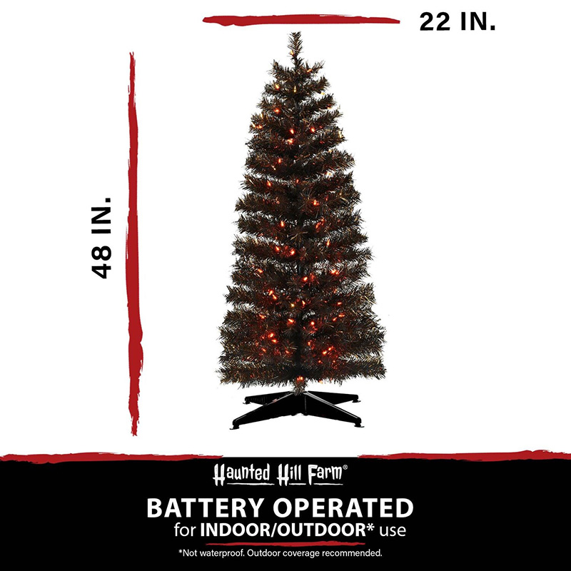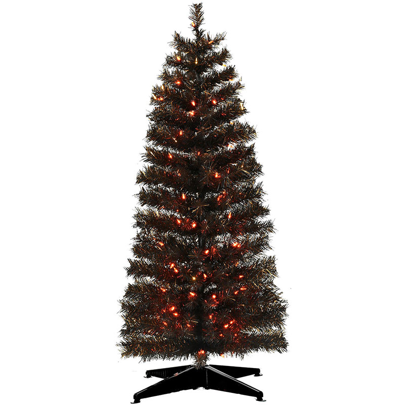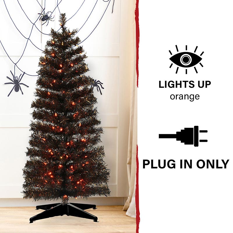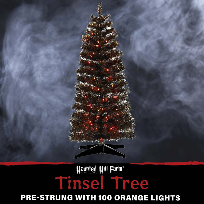 - NOT JUST FOR CHRISTMAS! Black tinsel puts a playful twist on your Halloween decorating. Our 4-ft. tree will delight your trick or treaters with frightfully fun whimsy!