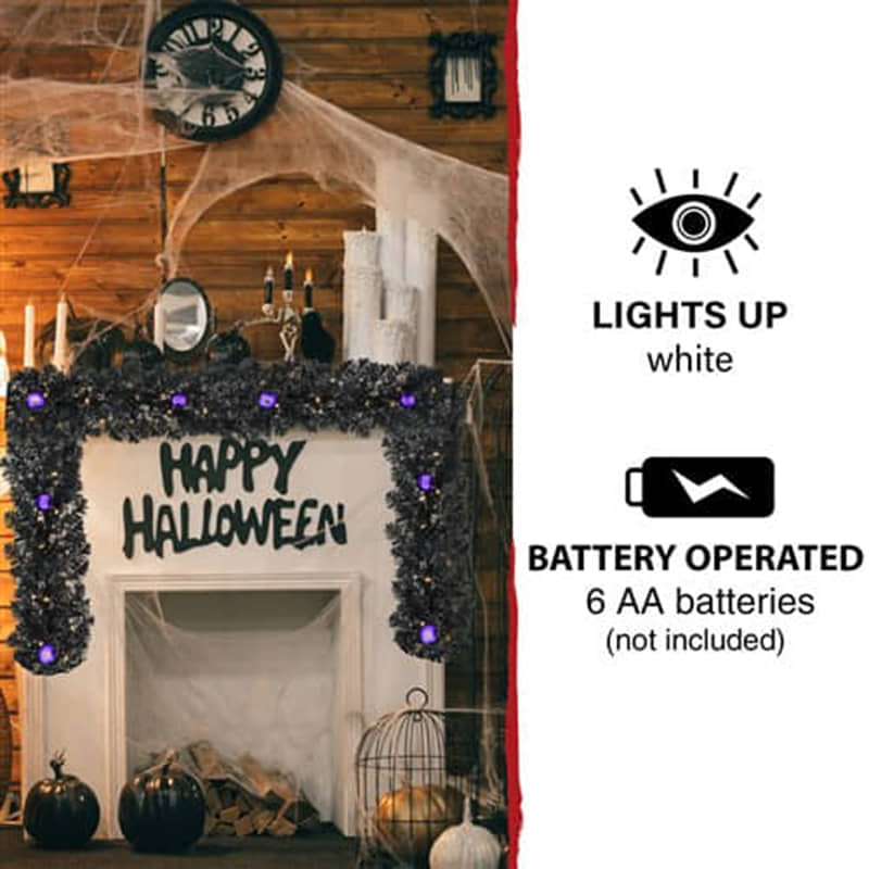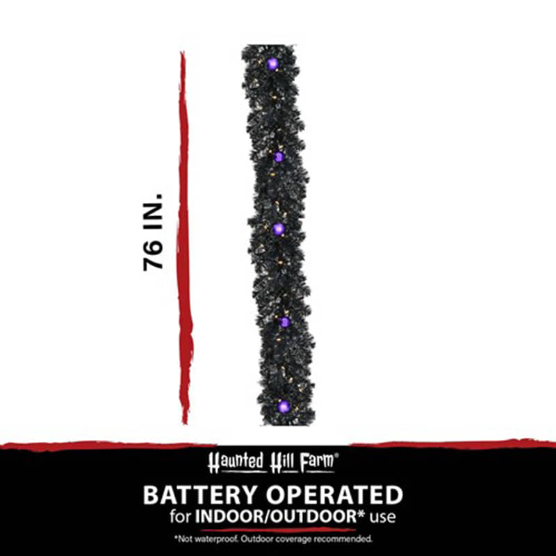 Add a little extra spook to your Halloween with this 6-ft. black tinsel garland from Haunted Hill Farm. This ghostly garland will make an eerie statement in any room it’s placed in from the moment you unbox it. Simply install 6 AA batteries and enjoy how the black tinsel needles reflect the warm LED lights from every angle (batteries not included). These lights are evenly distributed throughout the garland and provide extra light to your frightening display. Purple metal ornaments provide that extra spook for years to come. This garland can be displayed on the porch, mantel, dining table, or door frame of your haunted house. The Haunted Hill Farm tinsel garland is the final nail in the coffin for your decor this Halloween!