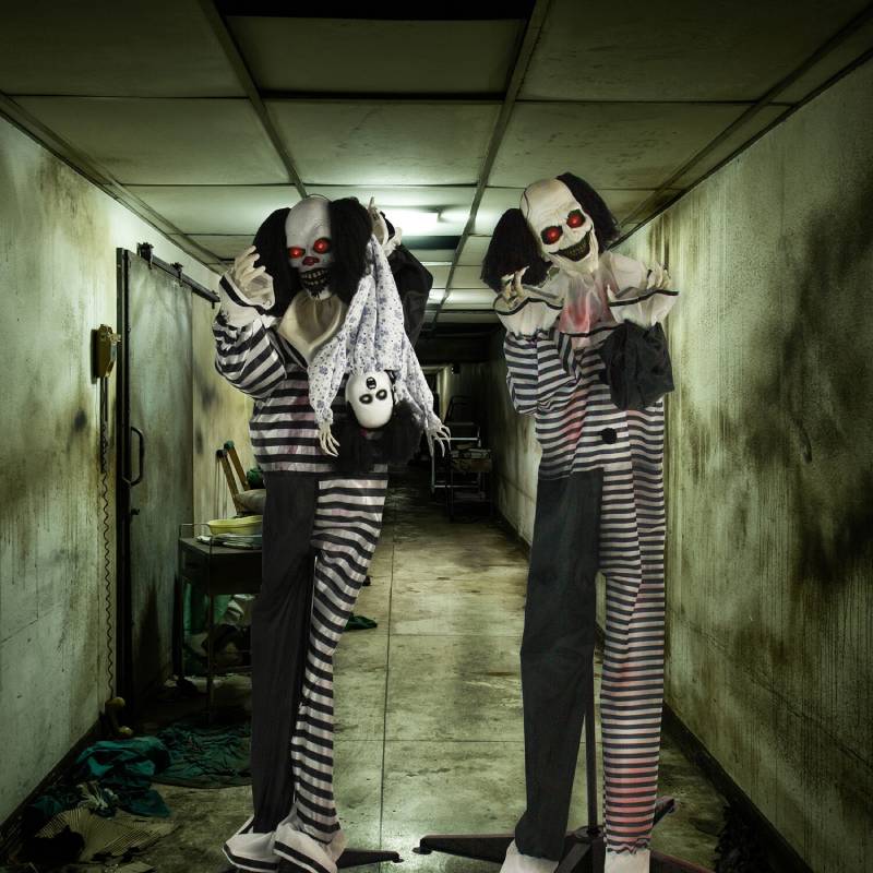 The Haunted Hill Farm HHCLOWN-11FLSA is a Halloween Animatronic. Be afraid. Be very afraid of Haunted Hill’s Haunted Circus Collection. These blood curdling creatures are sure to terrify any trick-or-treaters, co-workers, or customers. “Come closer,” Fester the Clown will say. With a wide eyed smile, he beckons, this way! But beware—he doesn’t want to play… Don’t be fooled by Fester’s grin. Whether suspended from his hanging loop or stood upright on his stand, his moving life-sized body will chill visitors to the bone. As his eyes flash a sinister red, they cast light on his dark hair and ghostly pale face. His thick black lips are stretched in a smile so wide, it reveals his yellowing teeth. Fester certainly looks excited, but you should be scared. To add to Fester’s upbeat appearance, re-position his poseable arms. Reach them outwards to tempt victims near or bend them straight up to give him a petrifying playful look. If not for his blood-stained pant suit, one might think Fester seems…friendly? That’s just what he wants.