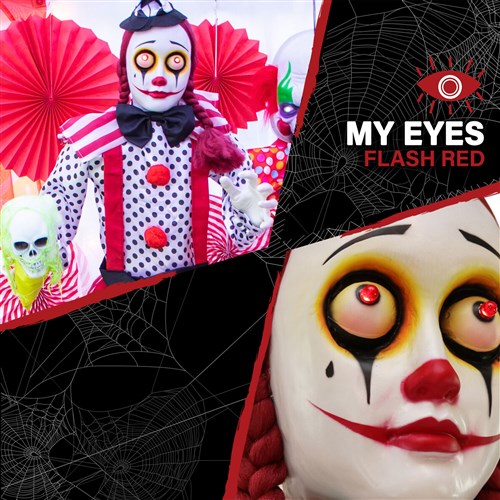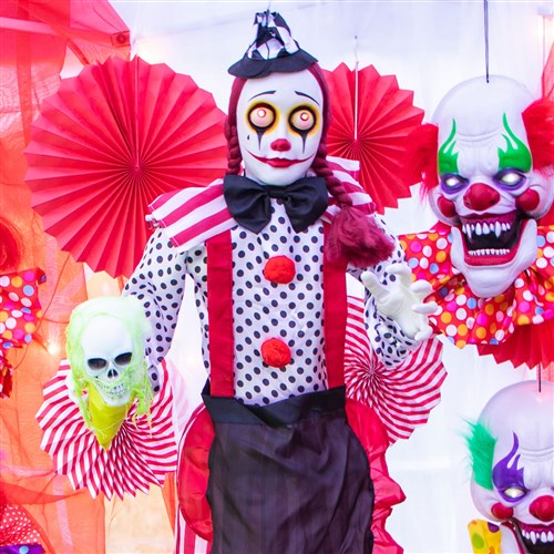Be afraid. Be very afraid of Haunted Hill Farm’s Haunted Circus Collection. These blood curdling creatures are sure to terrify any trick-or-treaters, co-workers, or customers. Buffy the Clown may not say much, but she doesn’t need to. Visitors will shrink with fear when the lay eyes on this sinister, yet sad mime clown. Don’t be fooled by Buffy’s woeful expression. It’s all part of her show… Buffy’s eyes flash a fearsome red as she performs in the night. Dressed in a festive clown costume complete with polka dots, stripes, and a hat, one might mistake Buffy as friendly. That is, until they see the skull she clutches in her eerily human-like hands. Bend Buffy’s arms into a variety of frightening positions to keep the scares coming all night. She’s happy to stand at your doorstep or hang from your porch to terrify trick-or-treaters, party guests, and neighbors the entire Halloween holiday season.