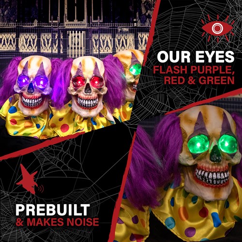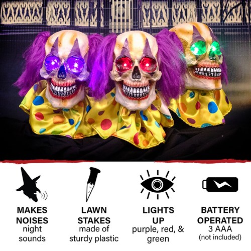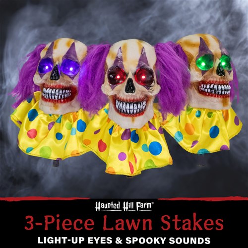 - Connected 3-piece clown skull lawn stakes come to life to step up your Halloween display
