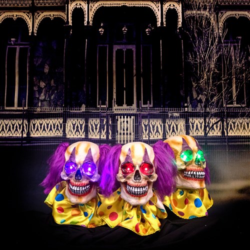 Be afraid! Be very afraid of the blood-curdling Haunted Circus Collection from Haunted Hill Farm. Vide, Audire, and Loqui, our 3-piece clown skull lawn stakes, are just what you need to turn your home into the scariest house on the block. Battery operated and bump activated, this smiley trio emits spooky night sounds while their eyes flicker and glow. Each clown’s eye color is different – either purple, red, or green. These spooktacular creatures will step up your Halloween decor and delight your guests.