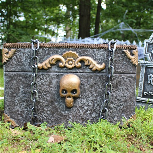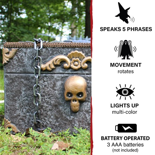 Be afraid! Be very afraid of Haunted Hill Farm’s Jebediah Bones Gravedigger Collection. Our blood-curdling creatures are sure to terrify any trick-or-treaters, co-workers, or customers. You may think this is any old pirate box, but you would be very wrong. CHEST is haunted and cursed! He is not afraid to show you his true colors. He laughs and mocks any passerby while moving back and forth. His multi-colored strobe lights frame the skull that keeps the demons within. Because he is battery-operated, he doesn’t worry about getting any wires mixed up. CHEST can move freely and haunt whoever he deems fit. He says, Trick or Treat, but he is only focused on the tricking part!